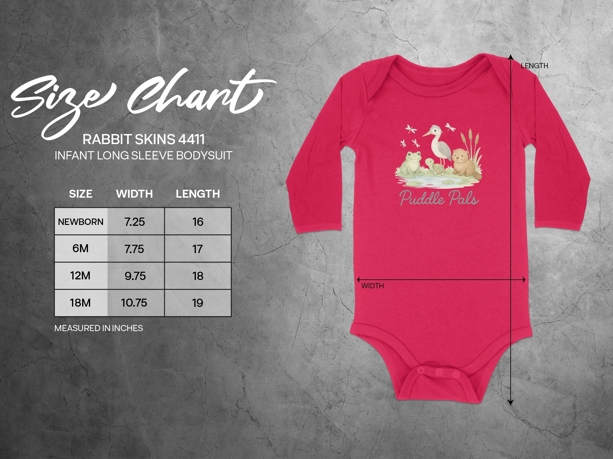 The design showcases these sweet animals enjoying a day by the water, complete with cattails and dragonflies, perfect for spring and summer. The Puddle Pals slogan adds a touch of whimsy to this charming design, making it a treasured piece in your baby’s wardrobe.