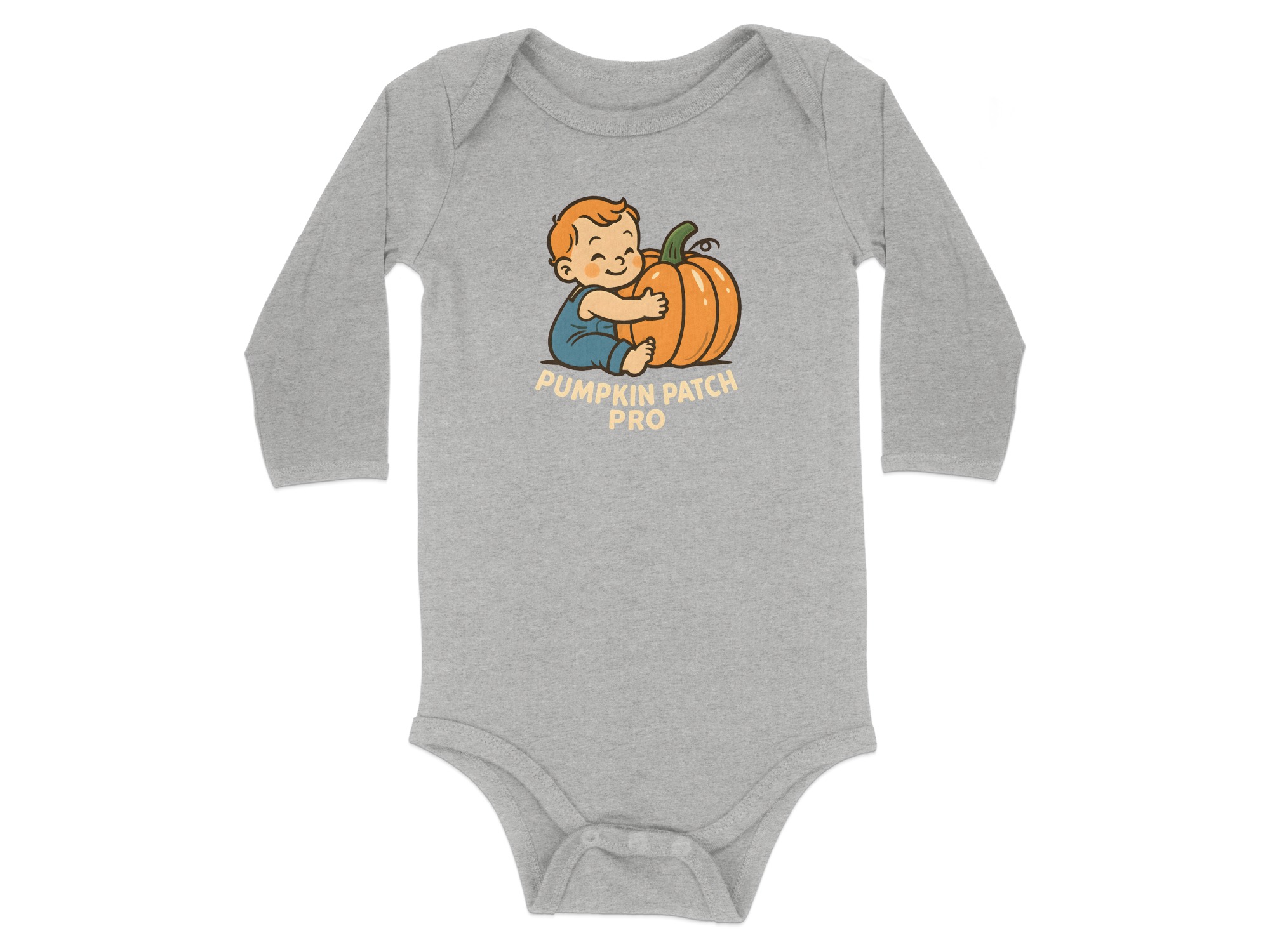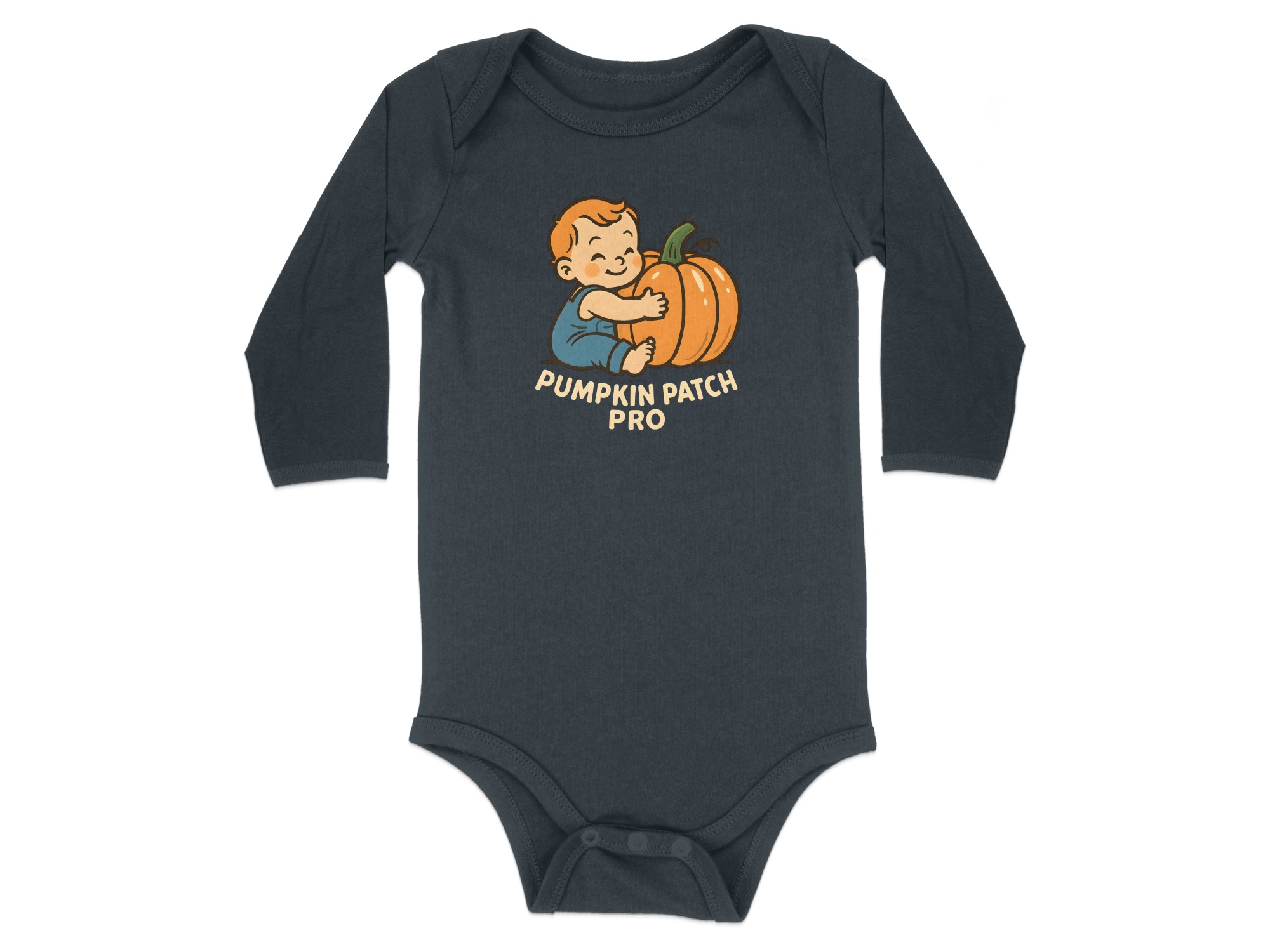 Pumpkin Patch Pro themed – Cute Halloween Cartoon Long Sleeve Baby Bodysuit. Soft, comfy, and kid-proof; perfect for pumpkin patches, parties, and trick-or-treat. Baby Bodysuit Sizes NB to 24M.