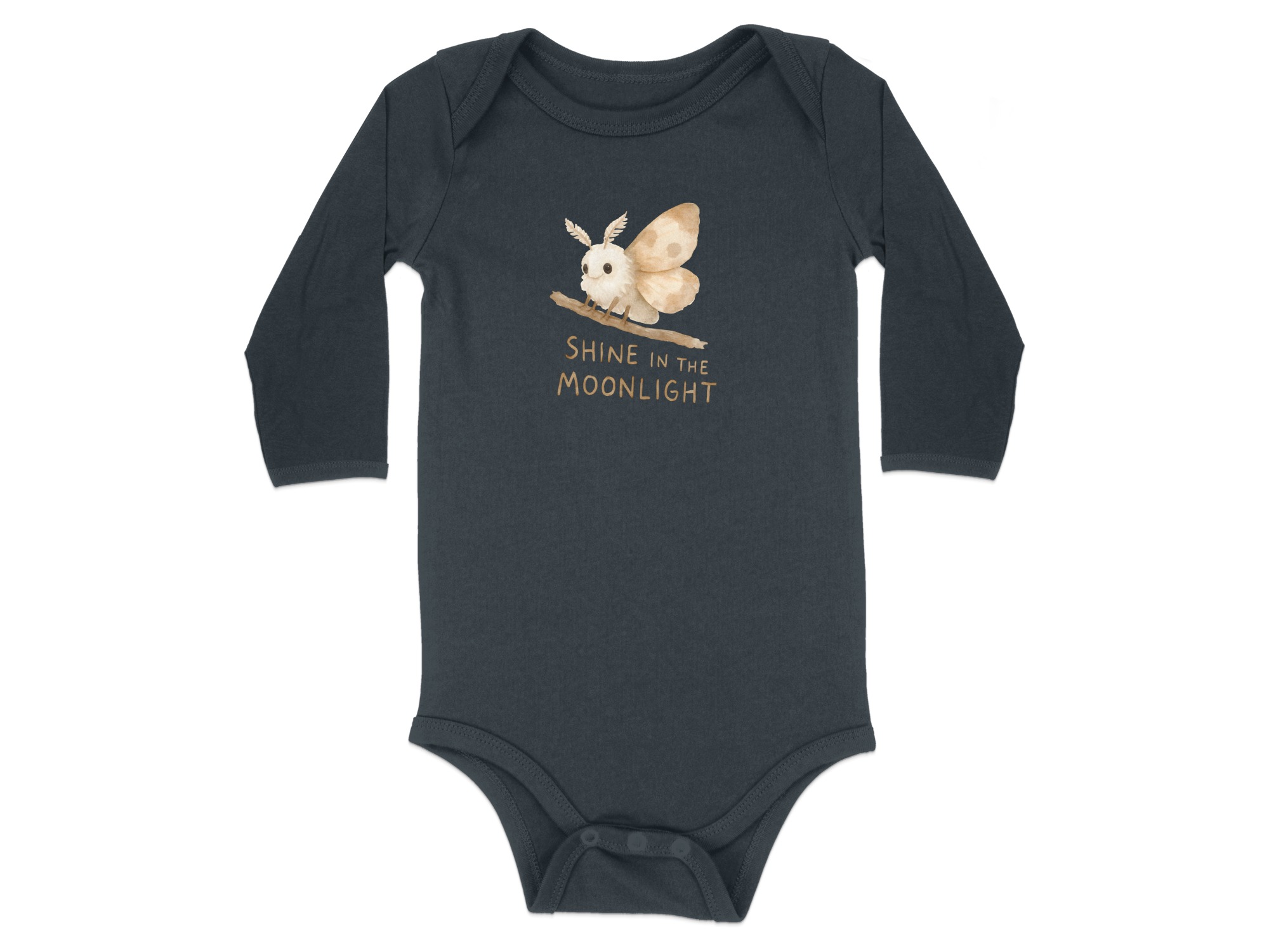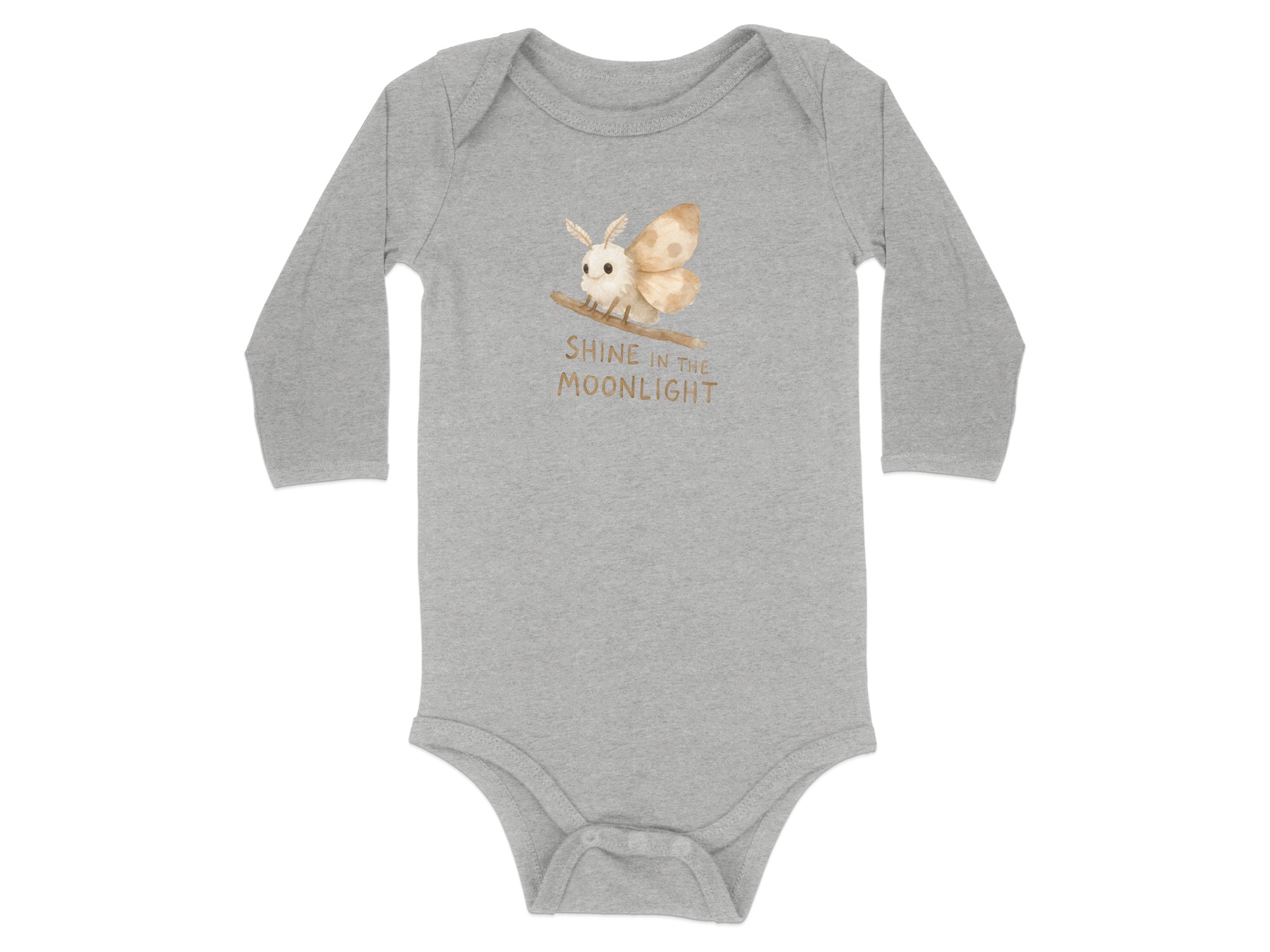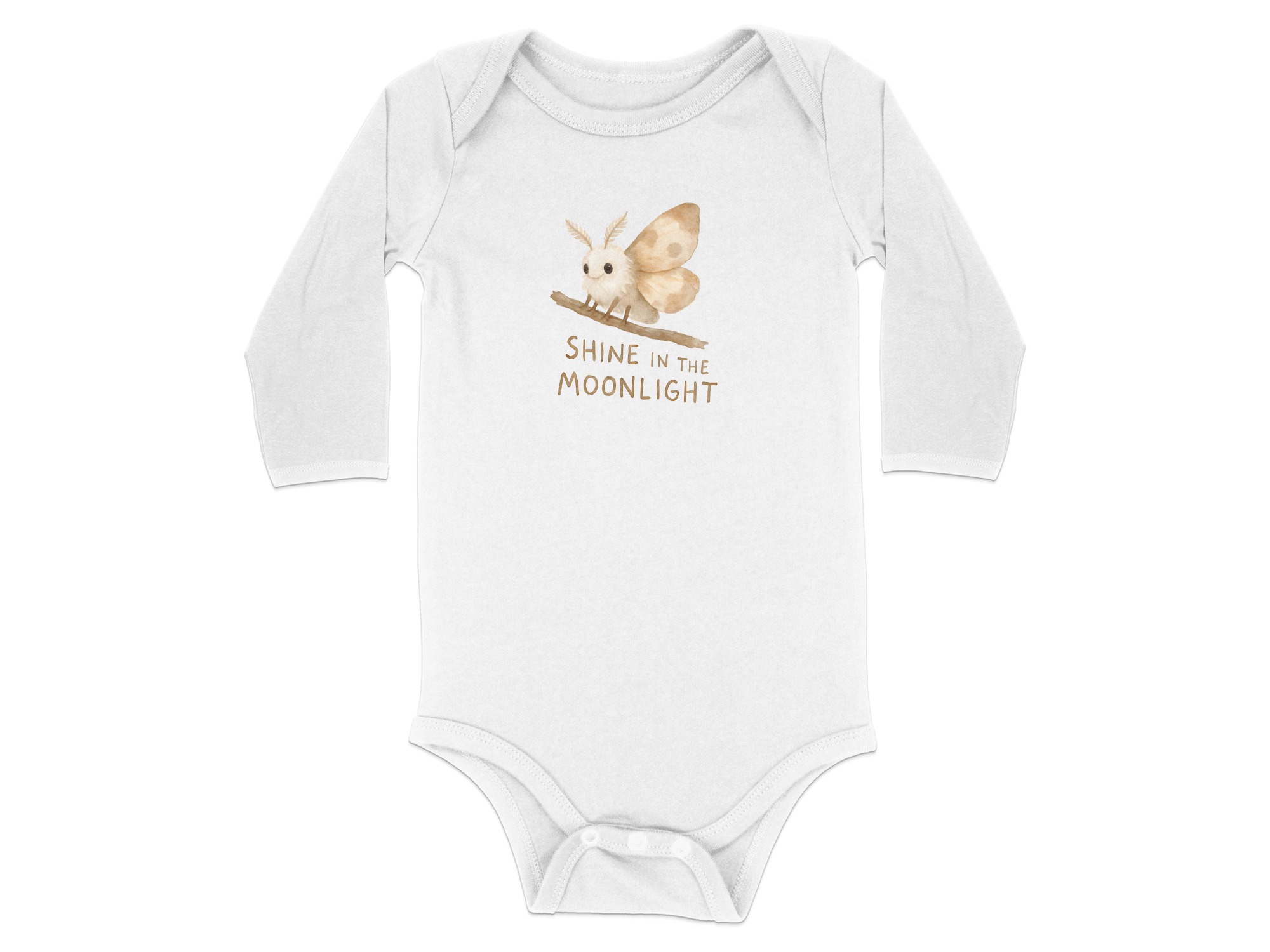 Shine like a moth to a flame in this adorable bodysuit! Featuring a cute moth watercolor design and “Shine in the Moonlight” text. Perfect for little stargazers!