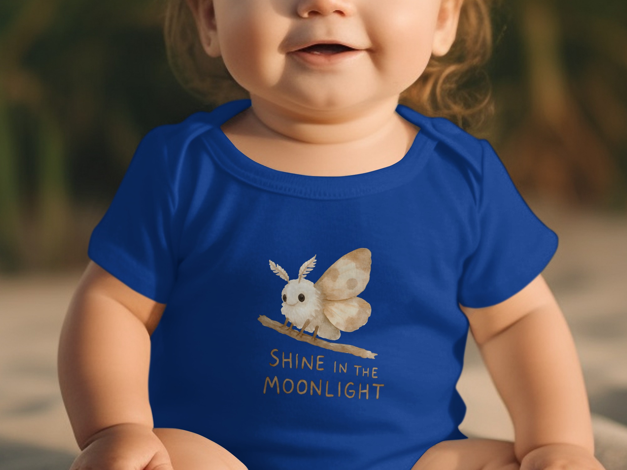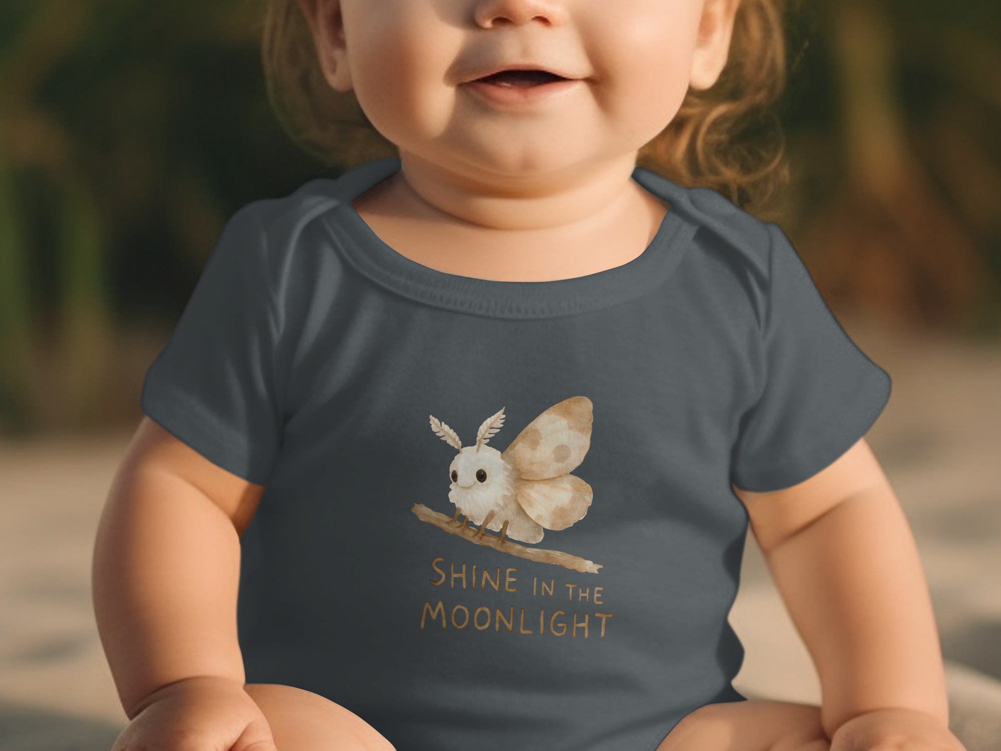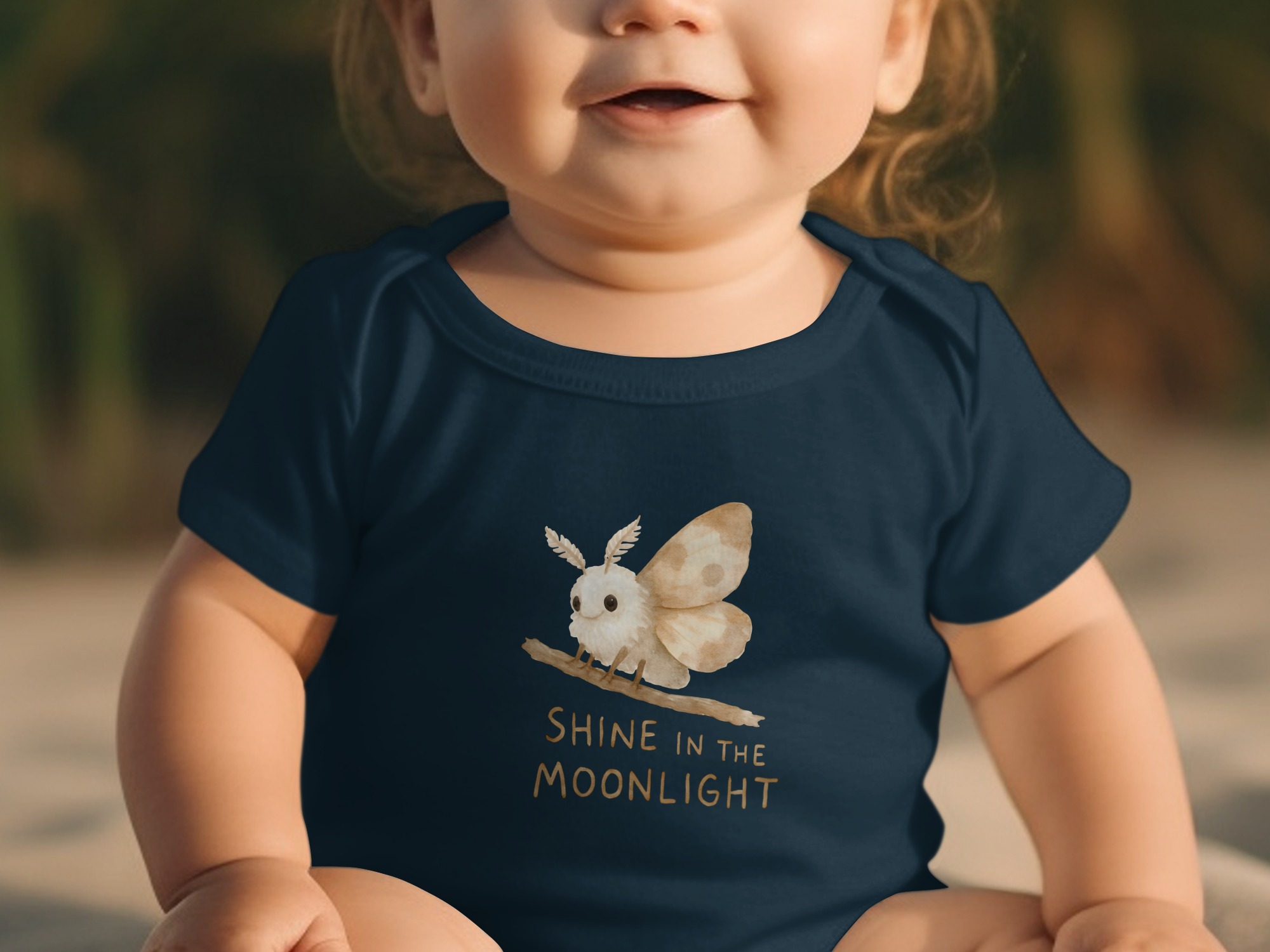 Shine like a moth to a flame in this adorable bodysuit! Featuring a cute moth watercolor design and “Shine in the Moonlight” text. Perfect for little stargazers!