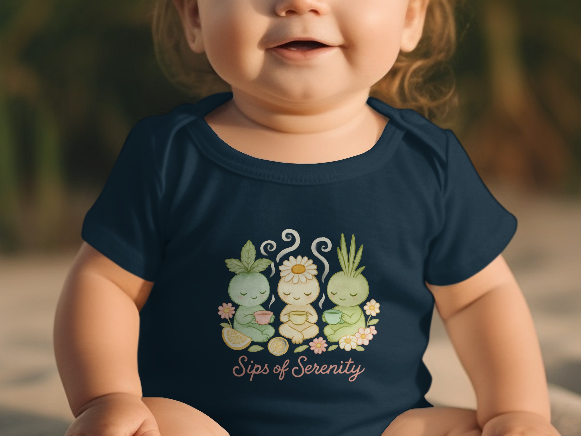Featuring an enchanting design of three cute root vegetable creatures with floral crowns and decorations, they are enjoying a relaxing tea party. Surrounded by whimsical flowers and citrus fruits, the peaceful scene, complete with the message “Sips of Serenity”, brings a touch of zen to your baby’s wardrobe. A unique blend of whimsy and tranquility, our bodysuits are designed to make your baby look and feel delightful.
