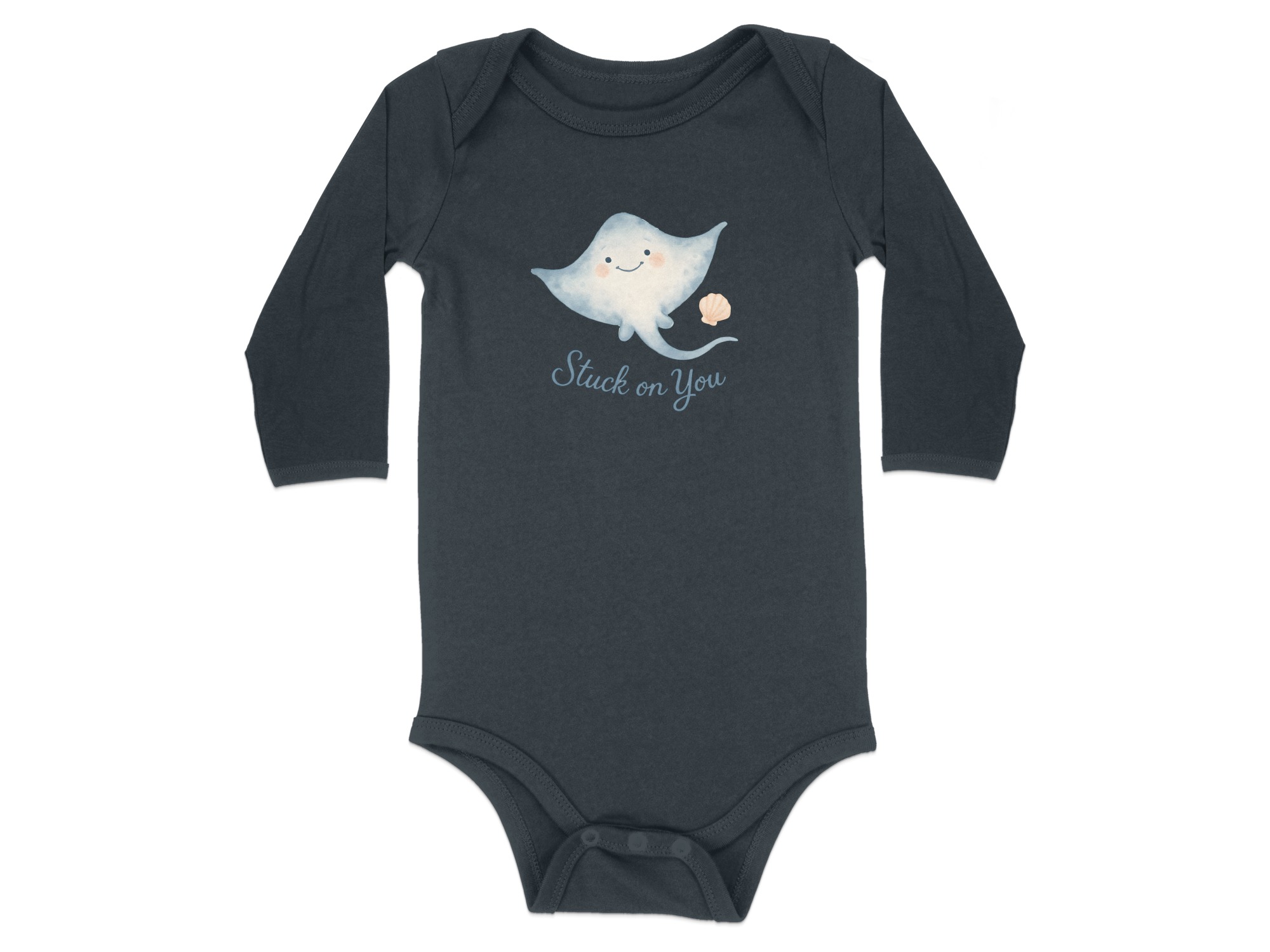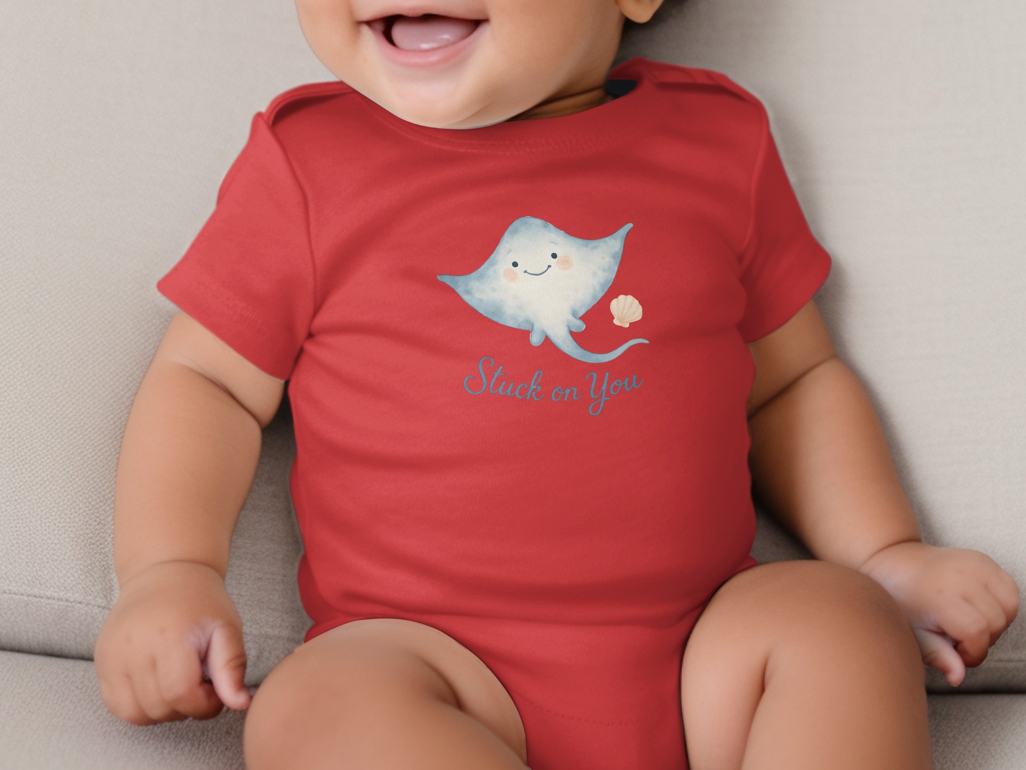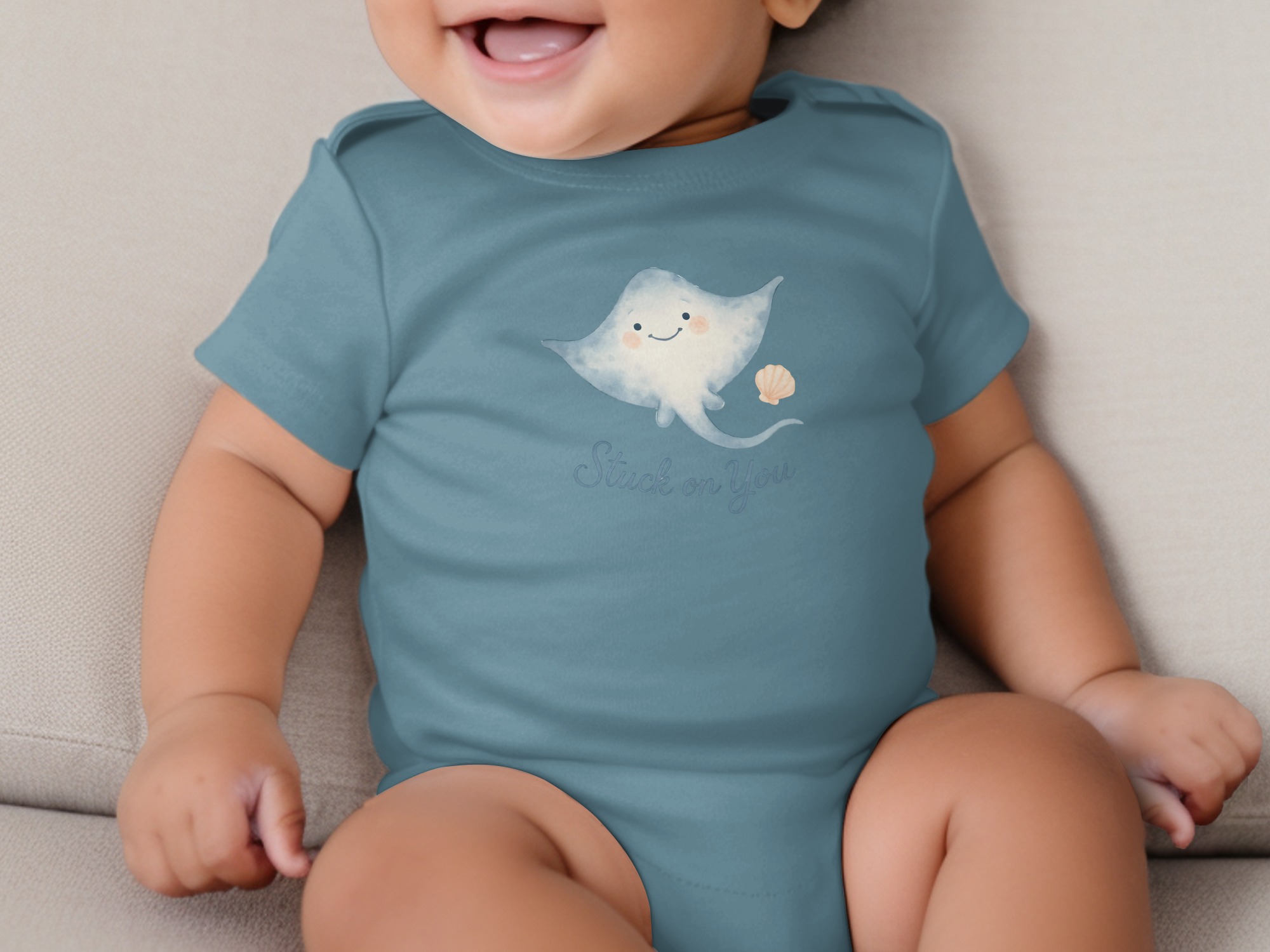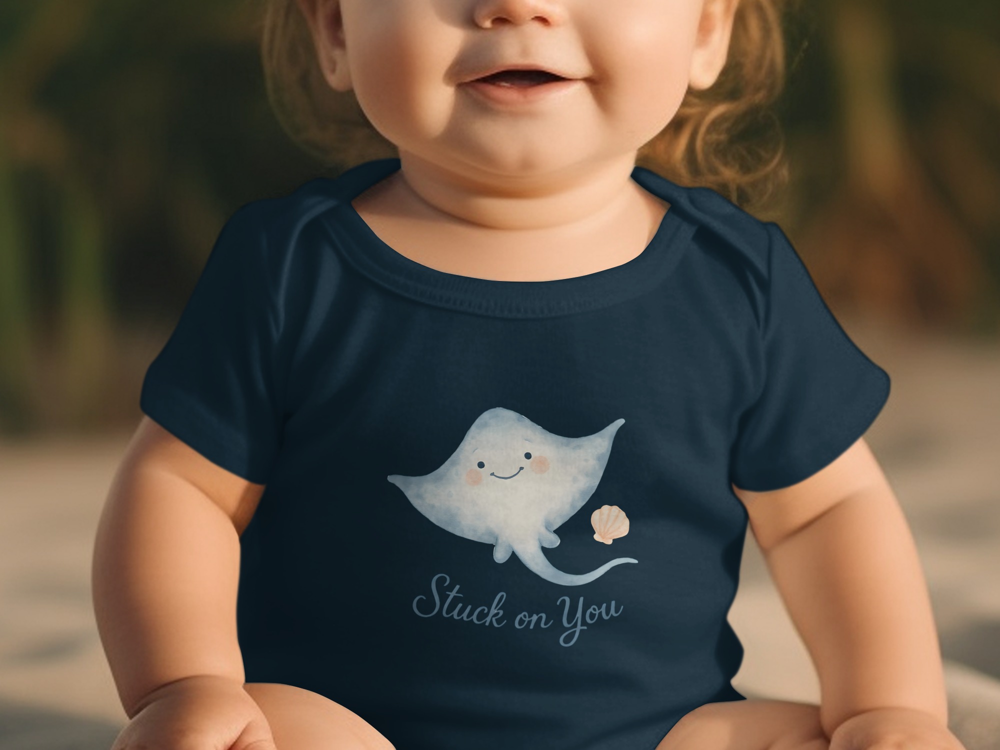 Cute baby bodysuits featuring adorable stingray design with “Stuck on You” text. Soft, comfy, perfect baby shower gift idea. Check out unique baby clothes!