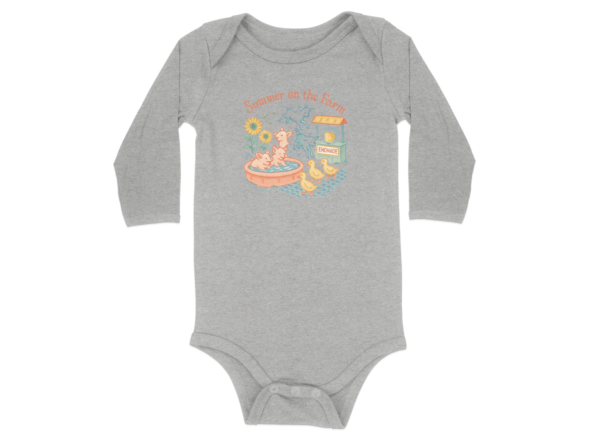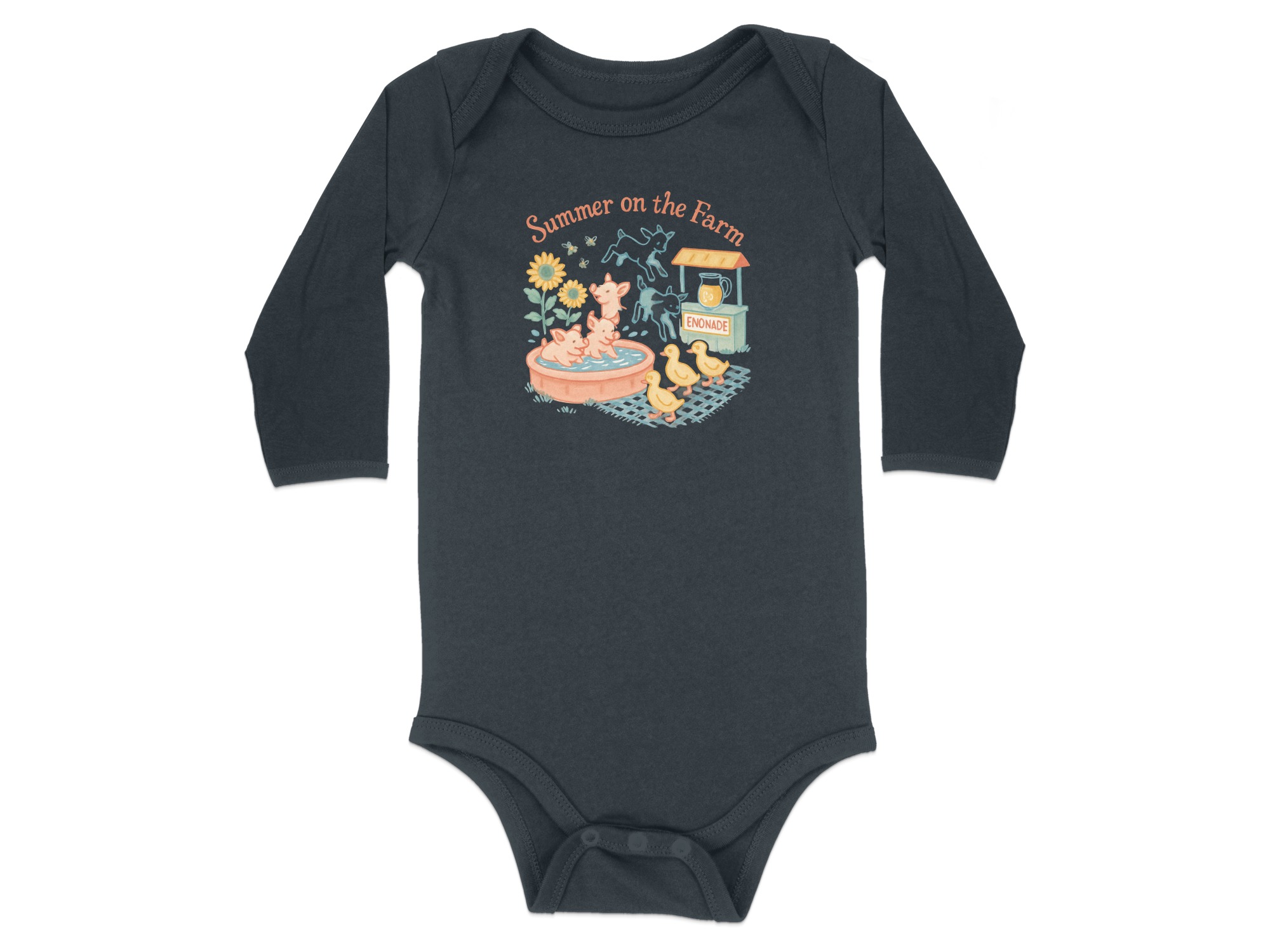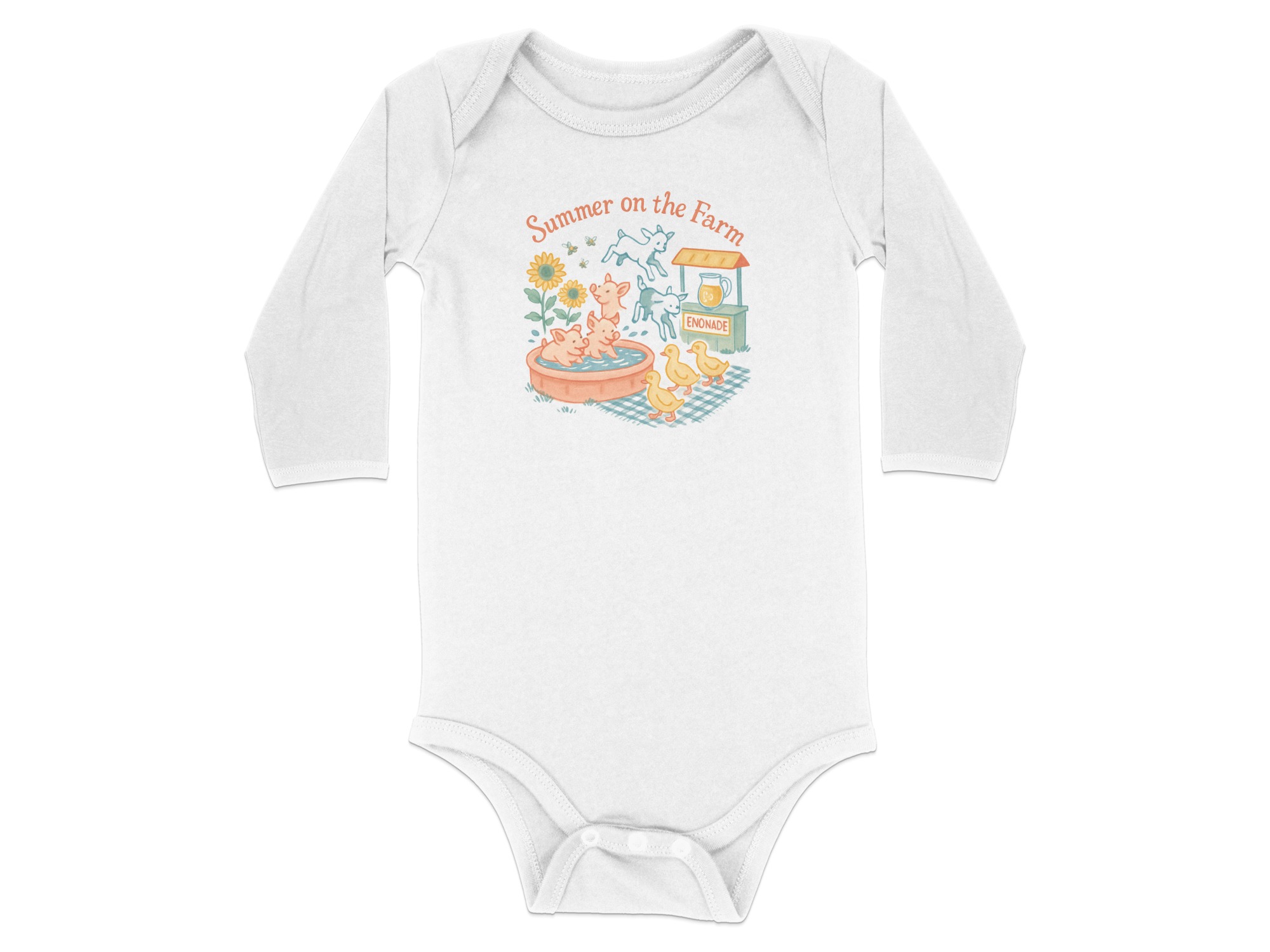 Celebrate summer with our adorable farm themed bodysuit! This design features cute illustrations of pigs enjoying a bath, playful goats, and charming ducklings. A fun enonade stand, complete with refreshing drink, adds to the summery feel. “Summer on the Farm” lettering completes the delightful scene. Perfect for your little one’s summer adventures! Bodysuits Long and Short Sleeve available in sizes NB to 24M.