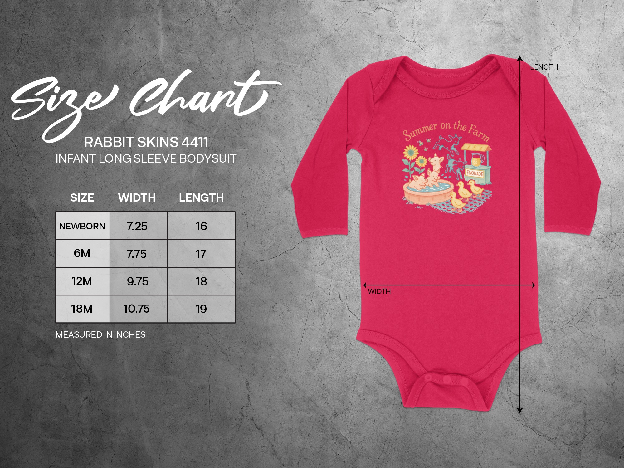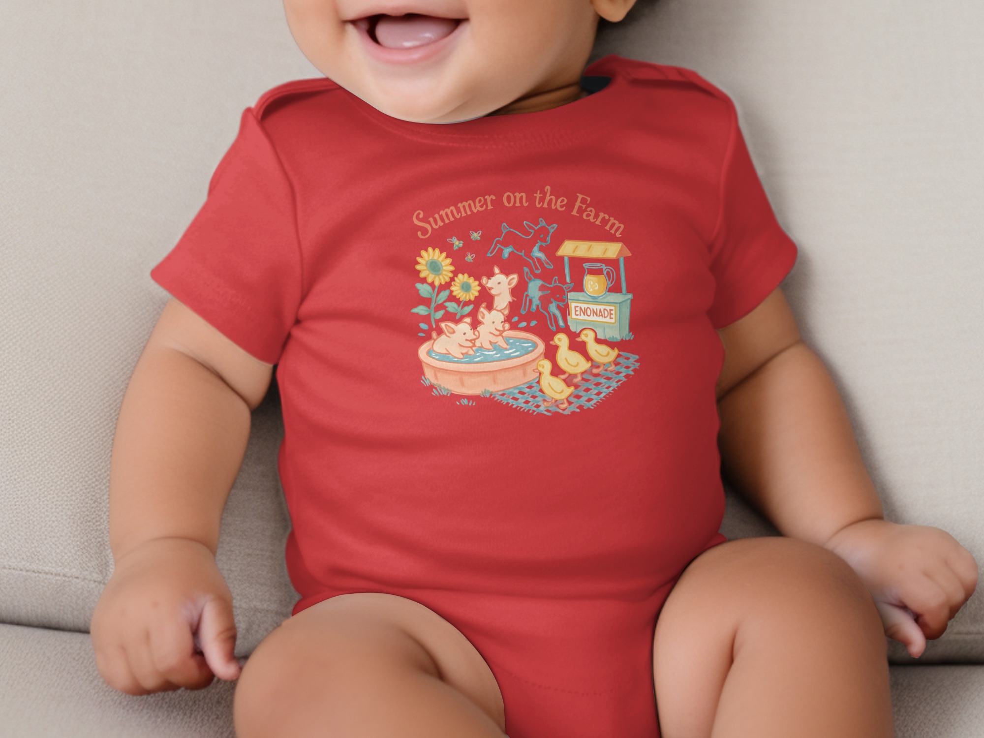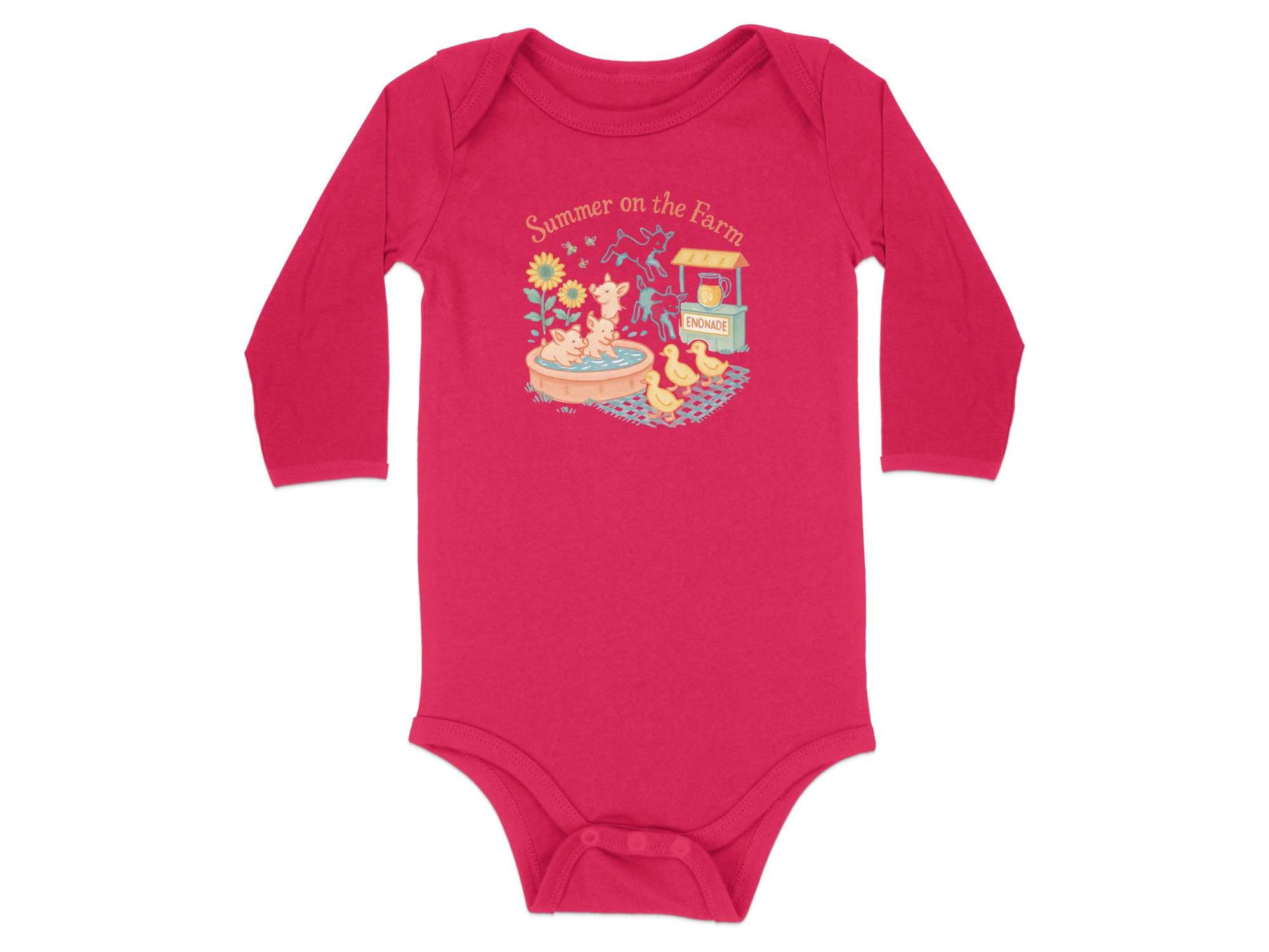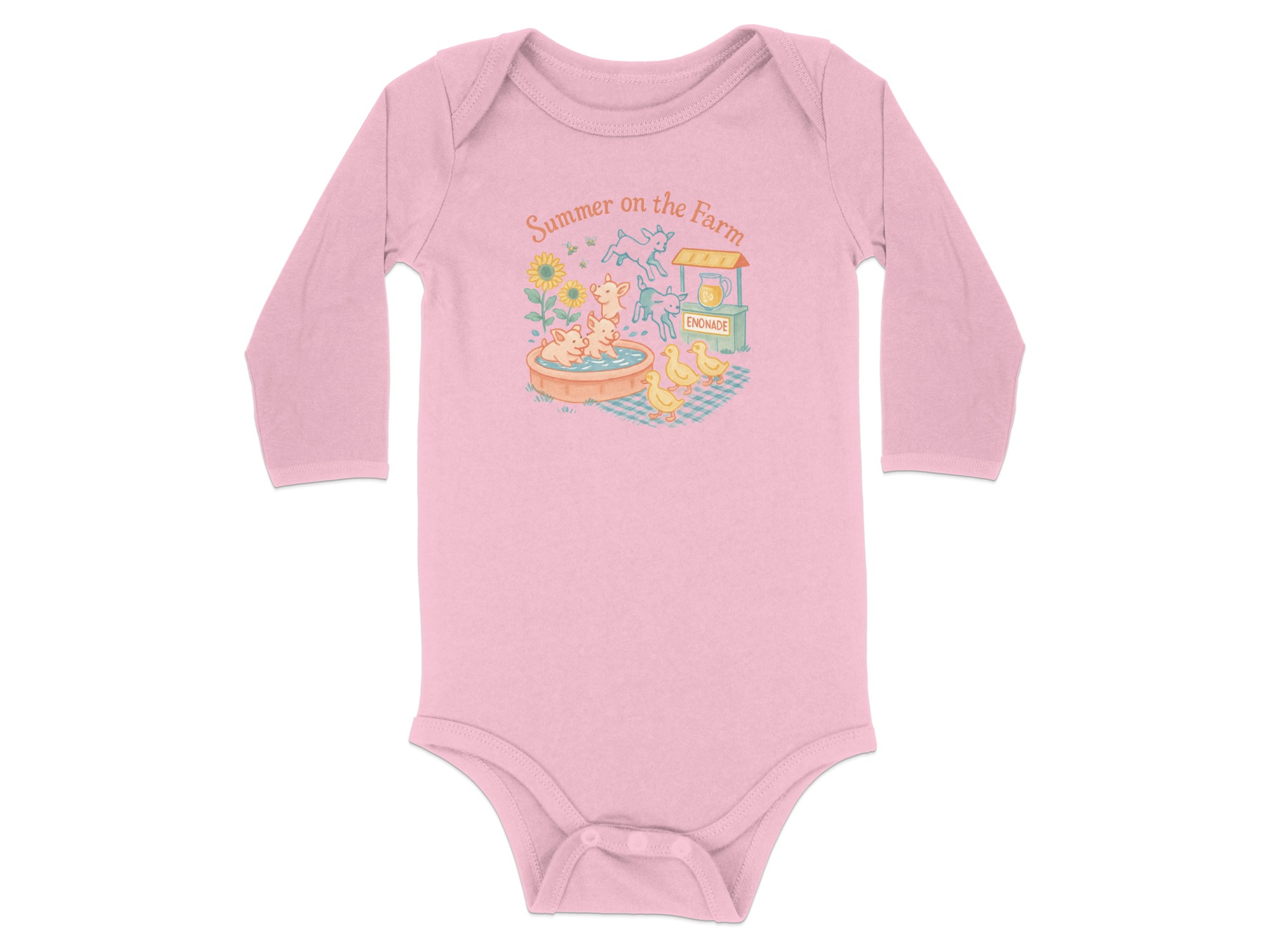 Celebrate summer with our adorable farm themed bodysuit! This design features cute illustrations of pigs enjoying a bath, playful goats, and charming ducklings. A fun enonade stand, complete with refreshing drink, adds to the summery feel. “Summer on the Farm” lettering completes the delightful scene. Perfect for your little one’s summer adventures! Bodysuits Long and Short Sleeve available in sizes NB to 24M.