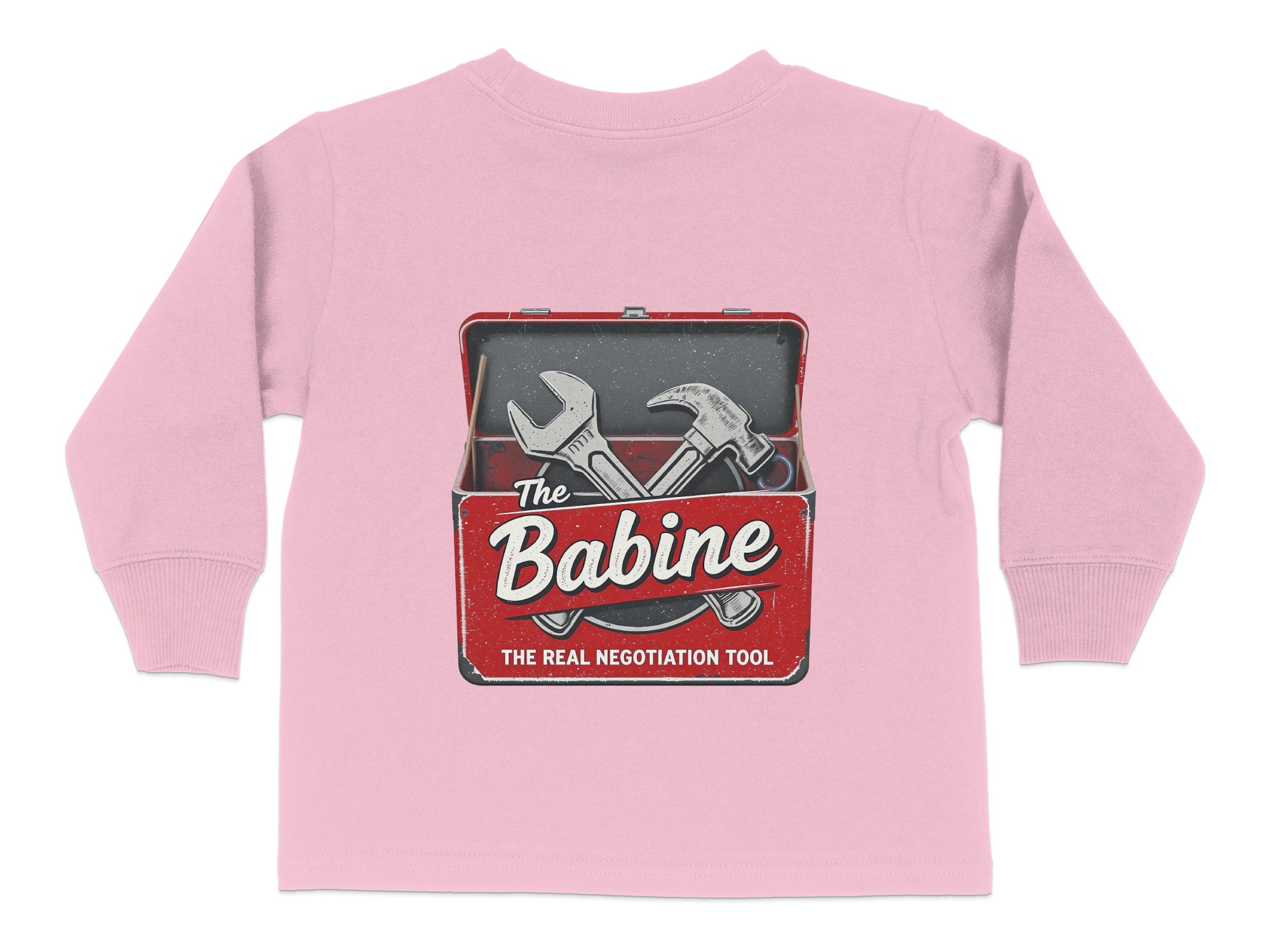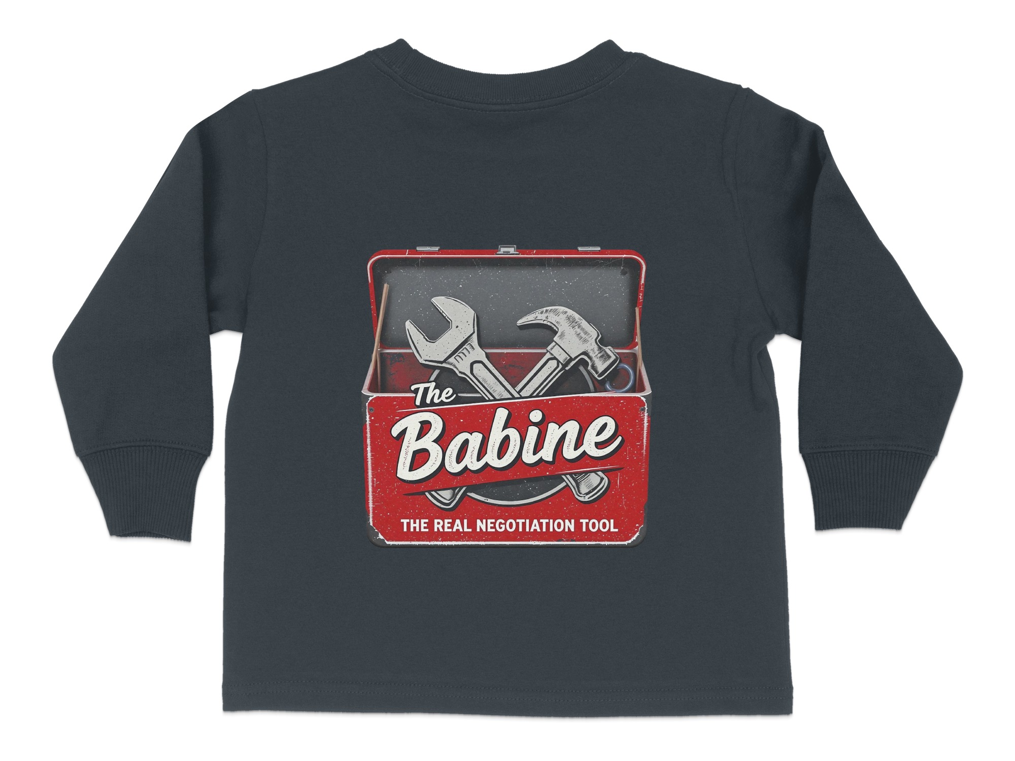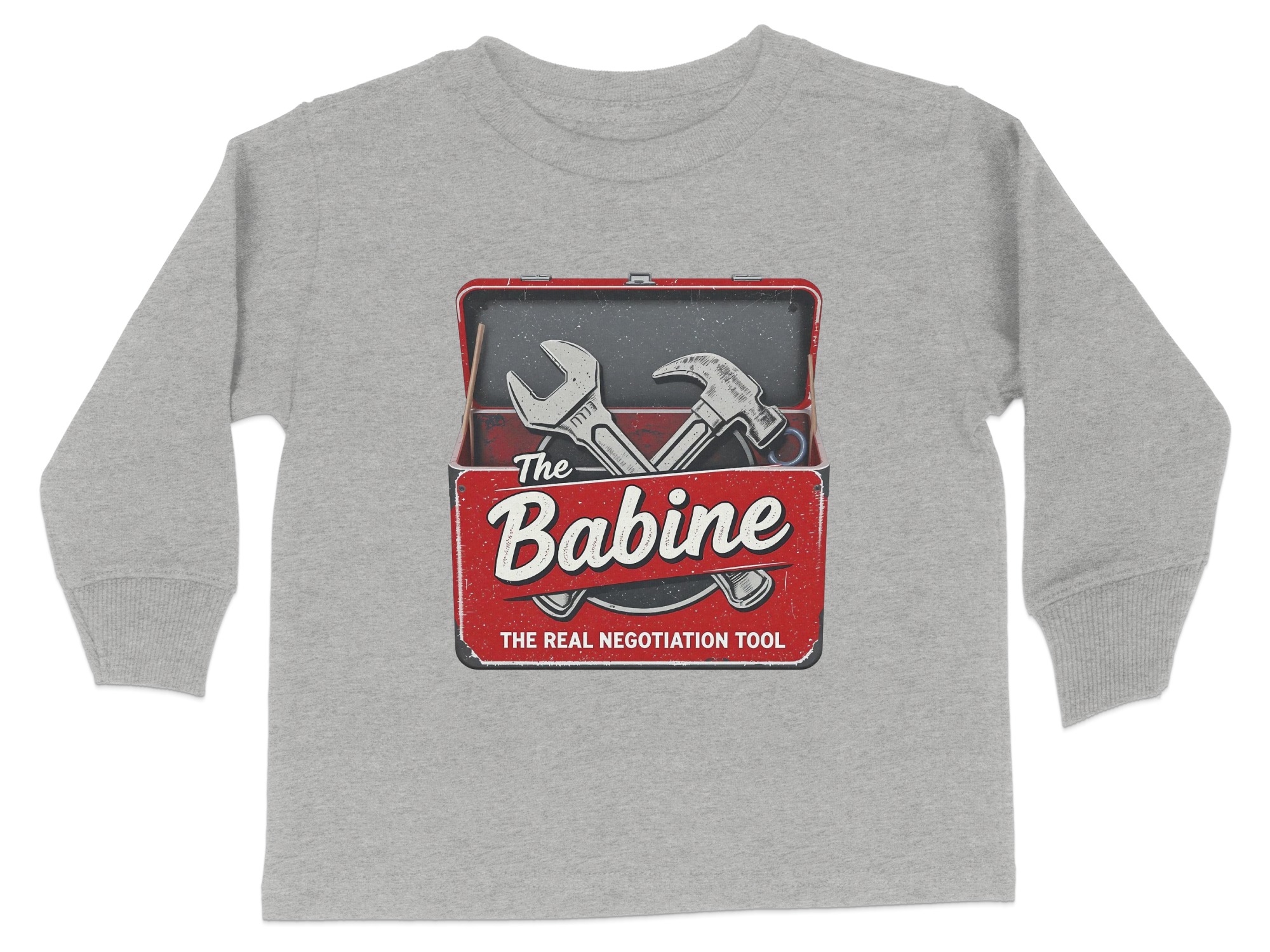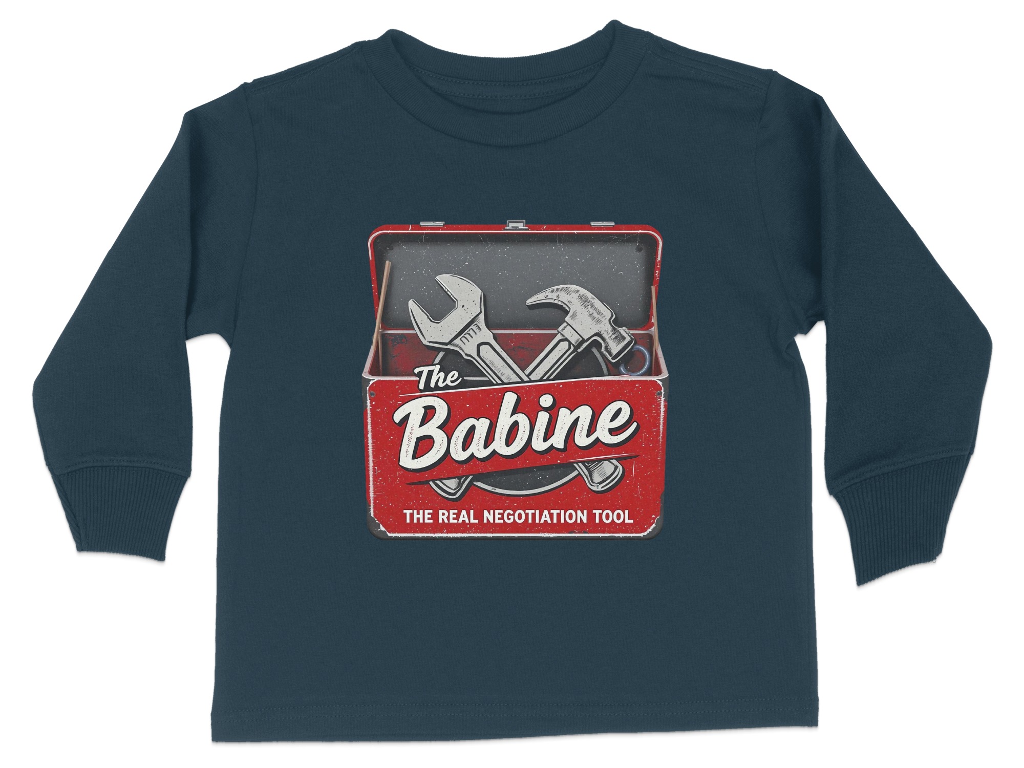 This “The Babine Real Negotiation Tool” Toddler Long Sleeve T-Shirt is an adorable and funny outfit for your little one. It features a playful design with a wrench and hammer, making it perfect for kids who love tools. Available in sizes 2T-4T, it makes for a wonderful gift or daily wear option.