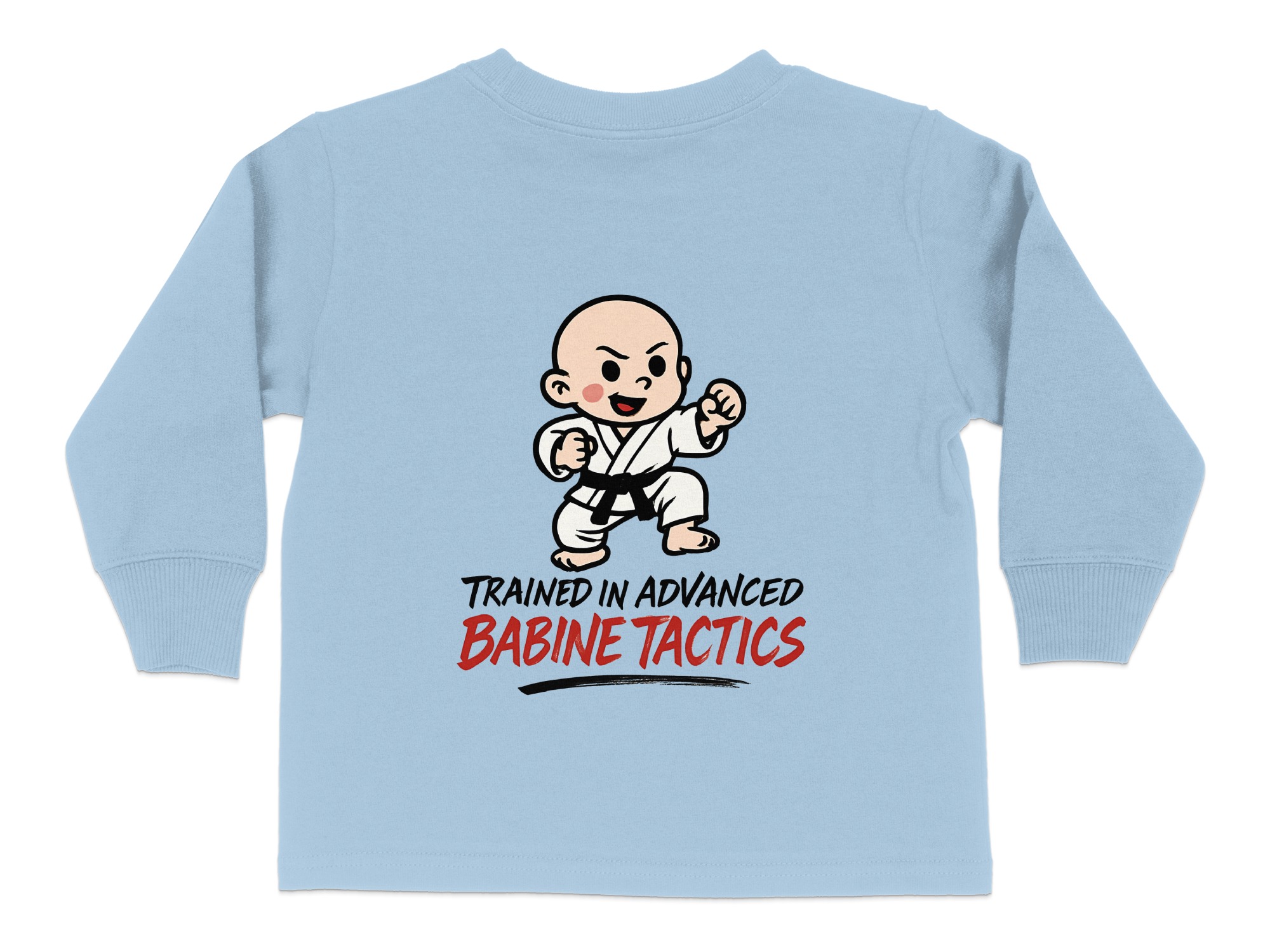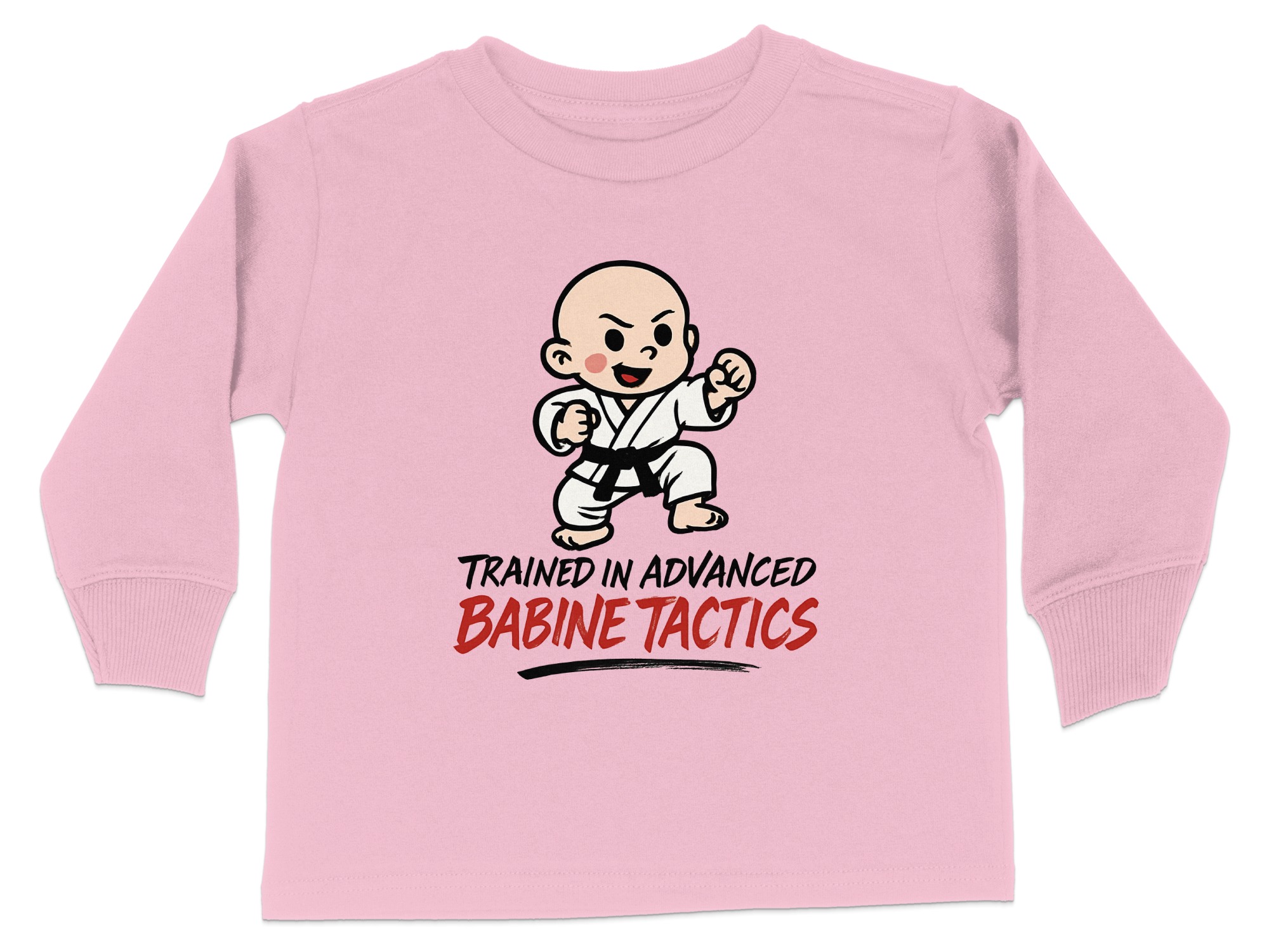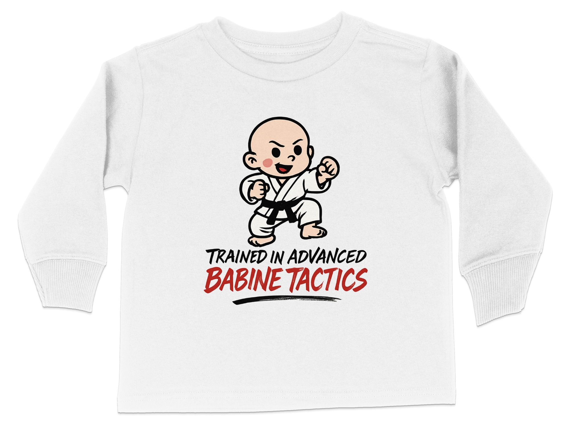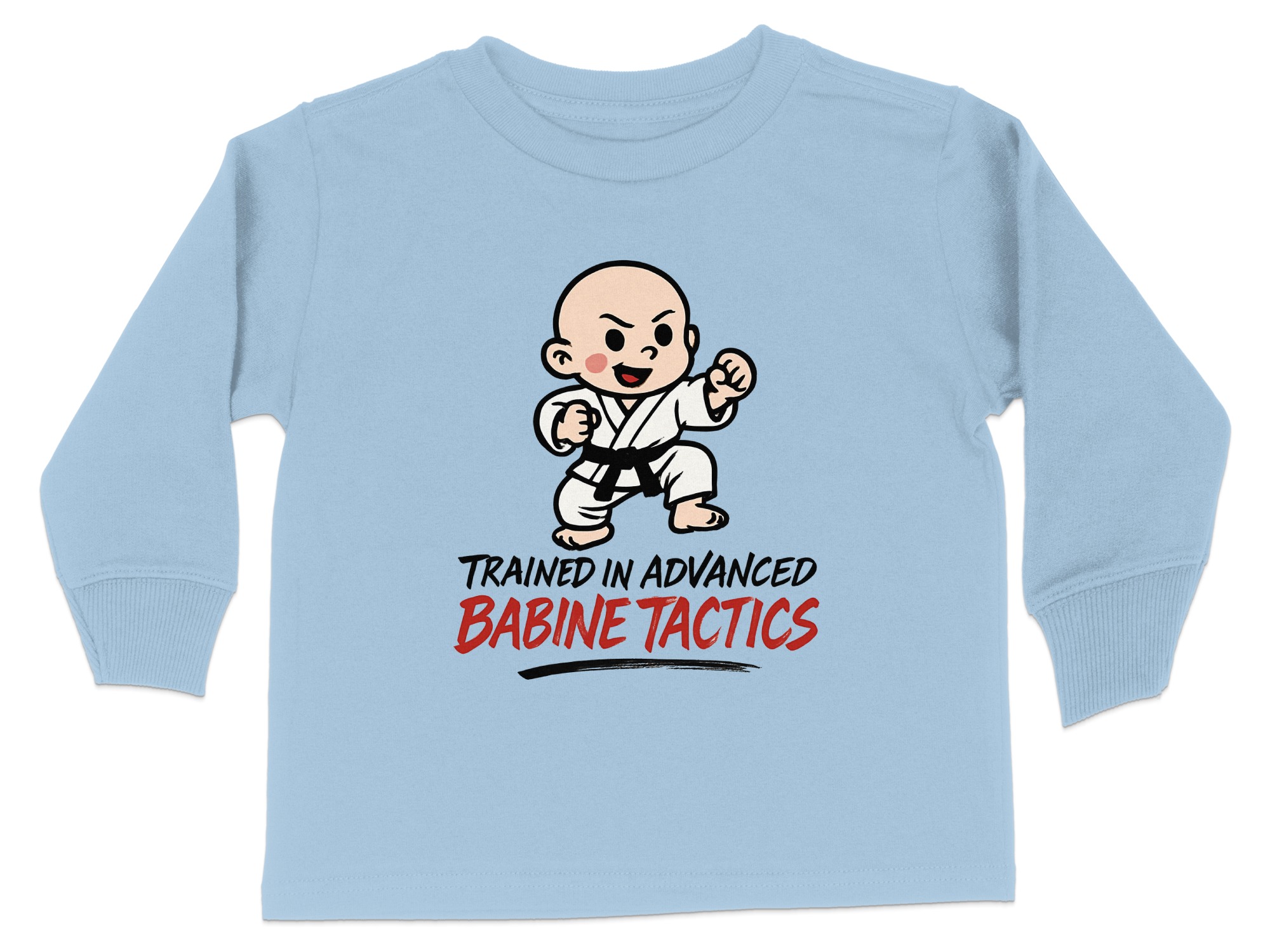 This adorable “Trained in Advanced Babine Tactics” toddler long sleeve t-shirt is perfect for your little martial artist. Featuring a cute cartoon character in a martial arts pose, it’s sure to bring smiles and laughs. Available in toddler sizes 2T-4T, this shirt makes a great gift for any occasion or a fun everyday outfit.