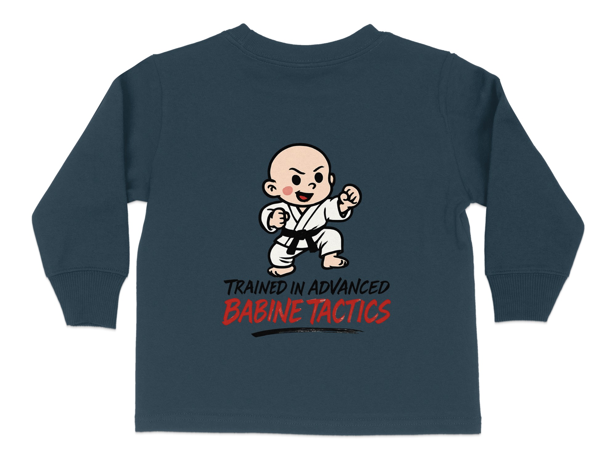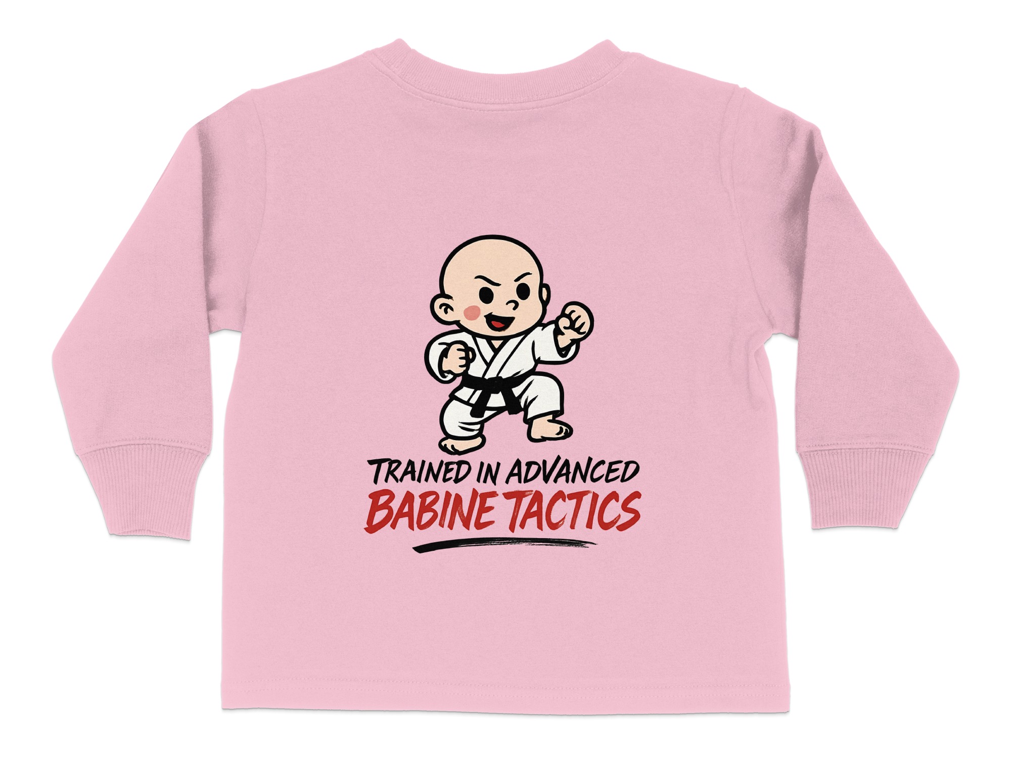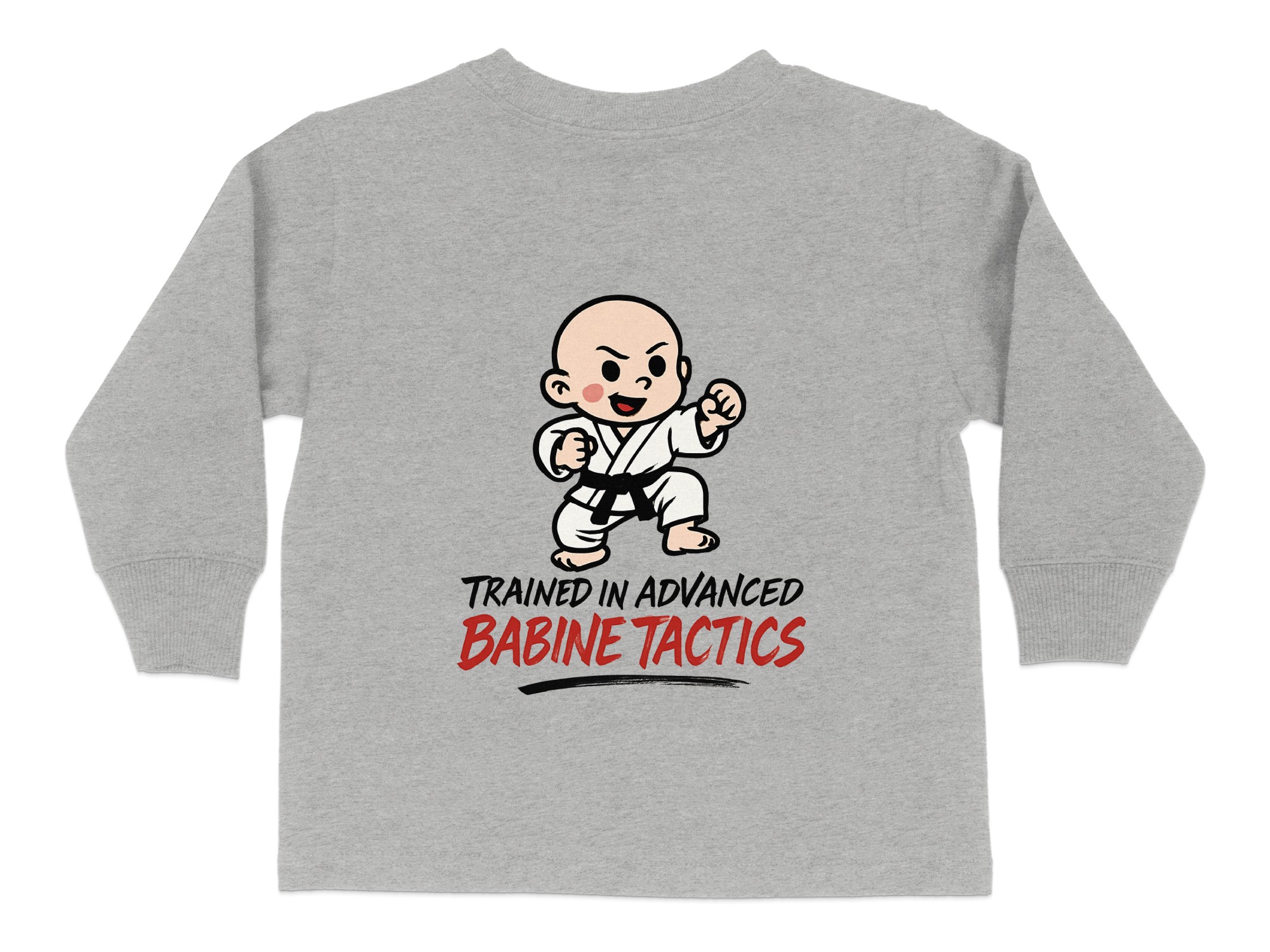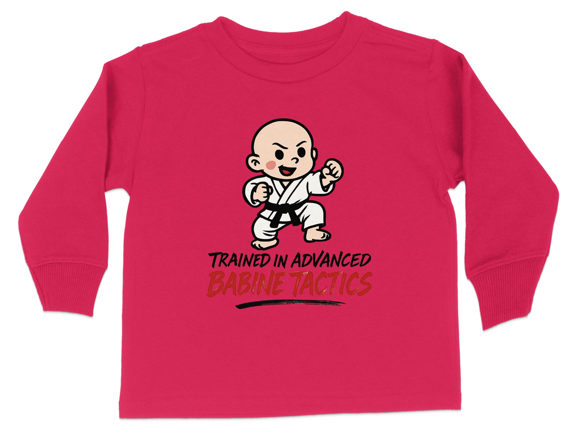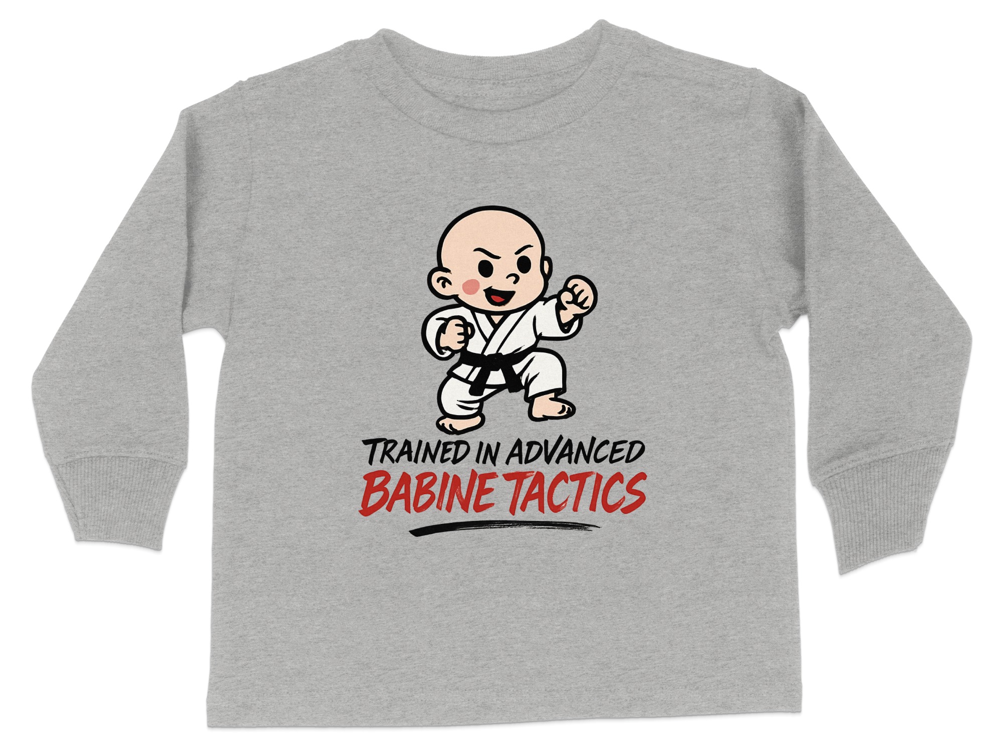 This adorable “Trained in Advanced Babine Tactics” toddler long sleeve t-shirt is perfect for your little martial artist. Featuring a cute cartoon character in a martial arts pose, it’s sure to bring smiles and laughs. Available in toddler sizes 2T-4T, this shirt makes a great gift for any occasion or a fun everyday outfit.