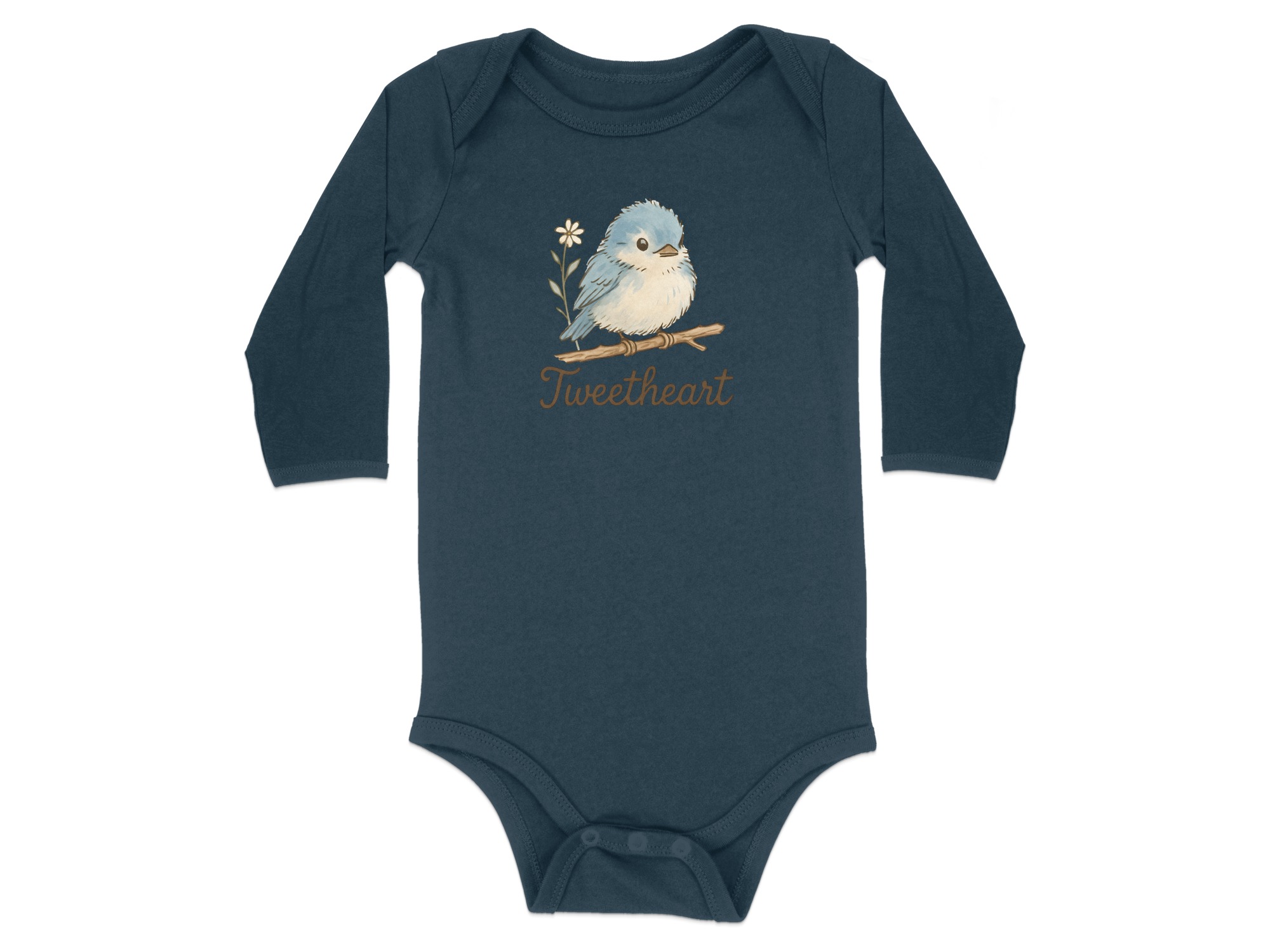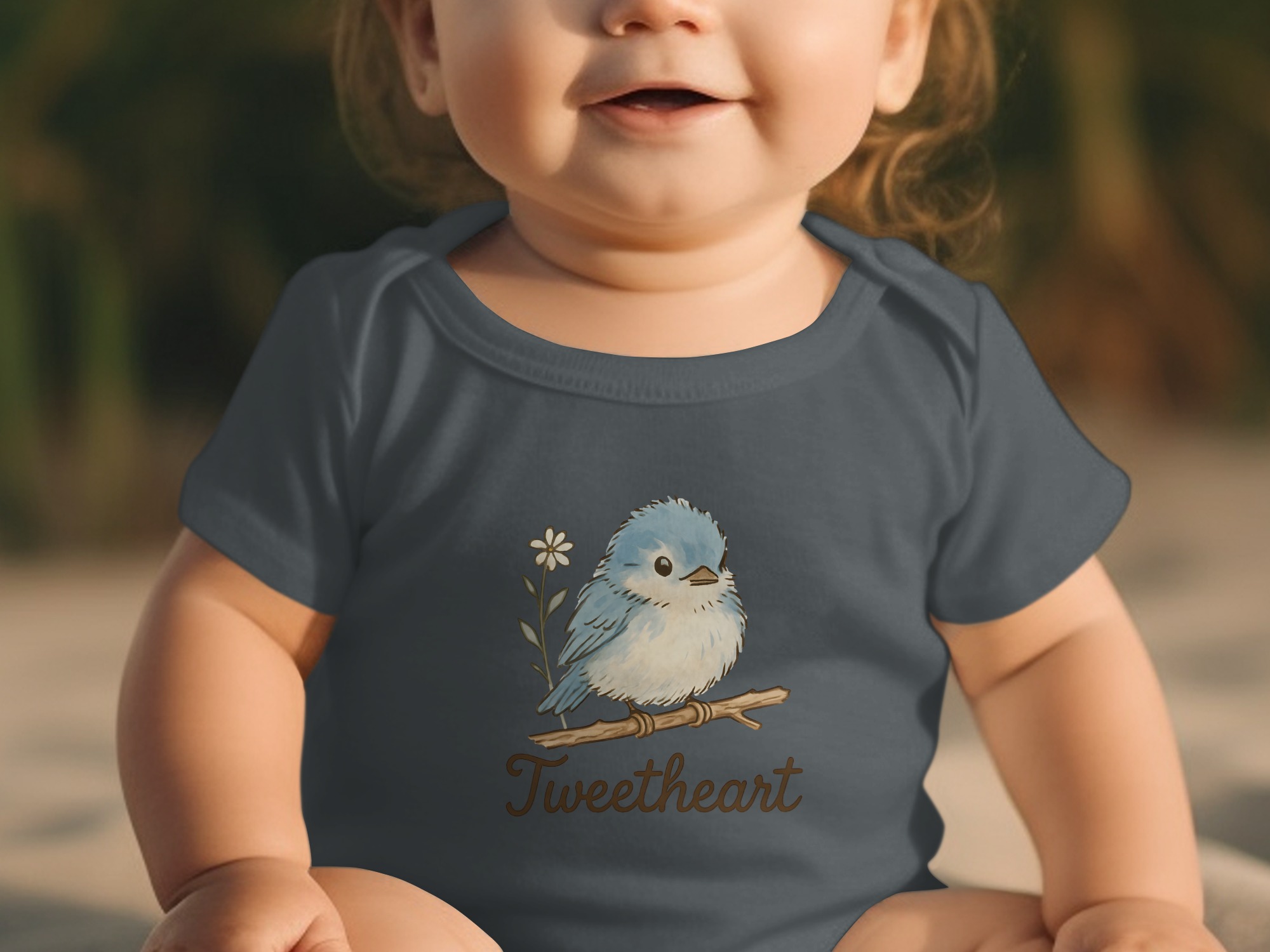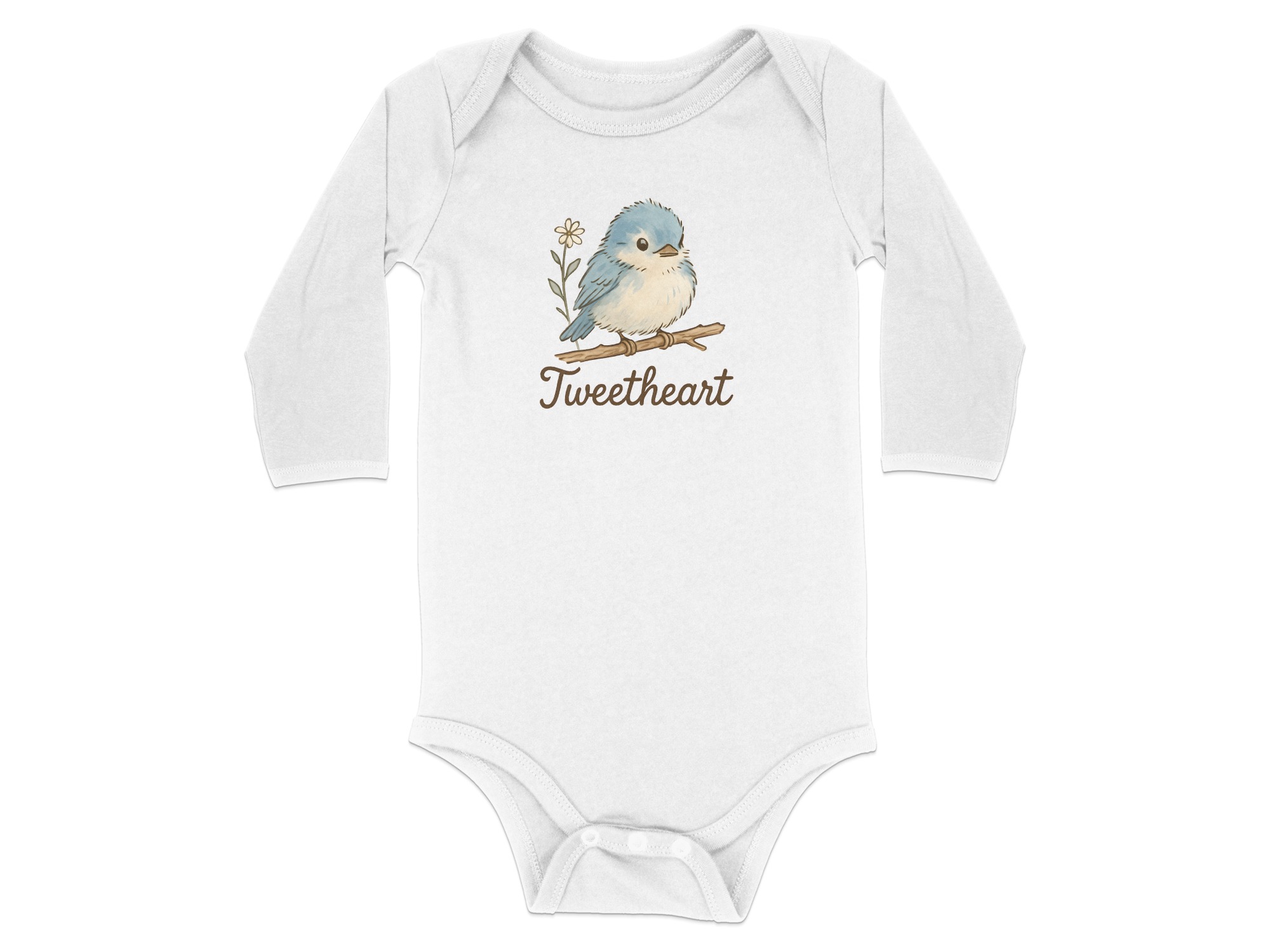 Adorable “Tweetheart” bodysuit featuring a cute blue bird on a branch with a daisy. Perfect for your little one! Find unique baby clothing here.