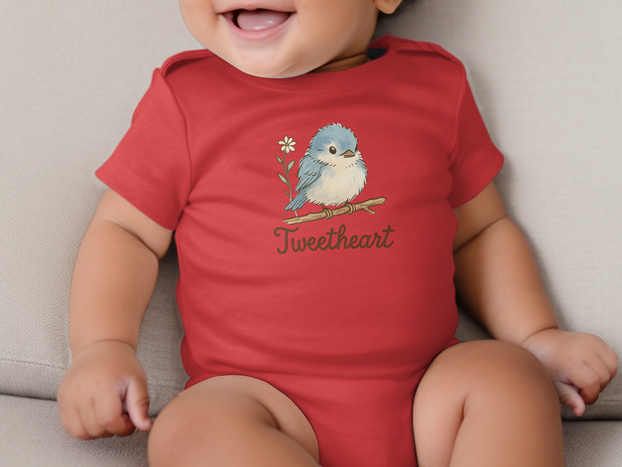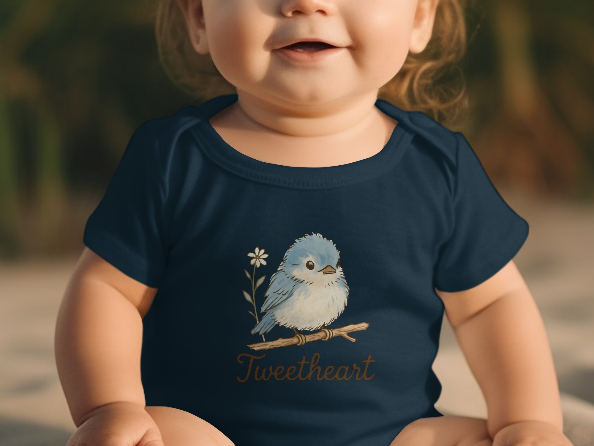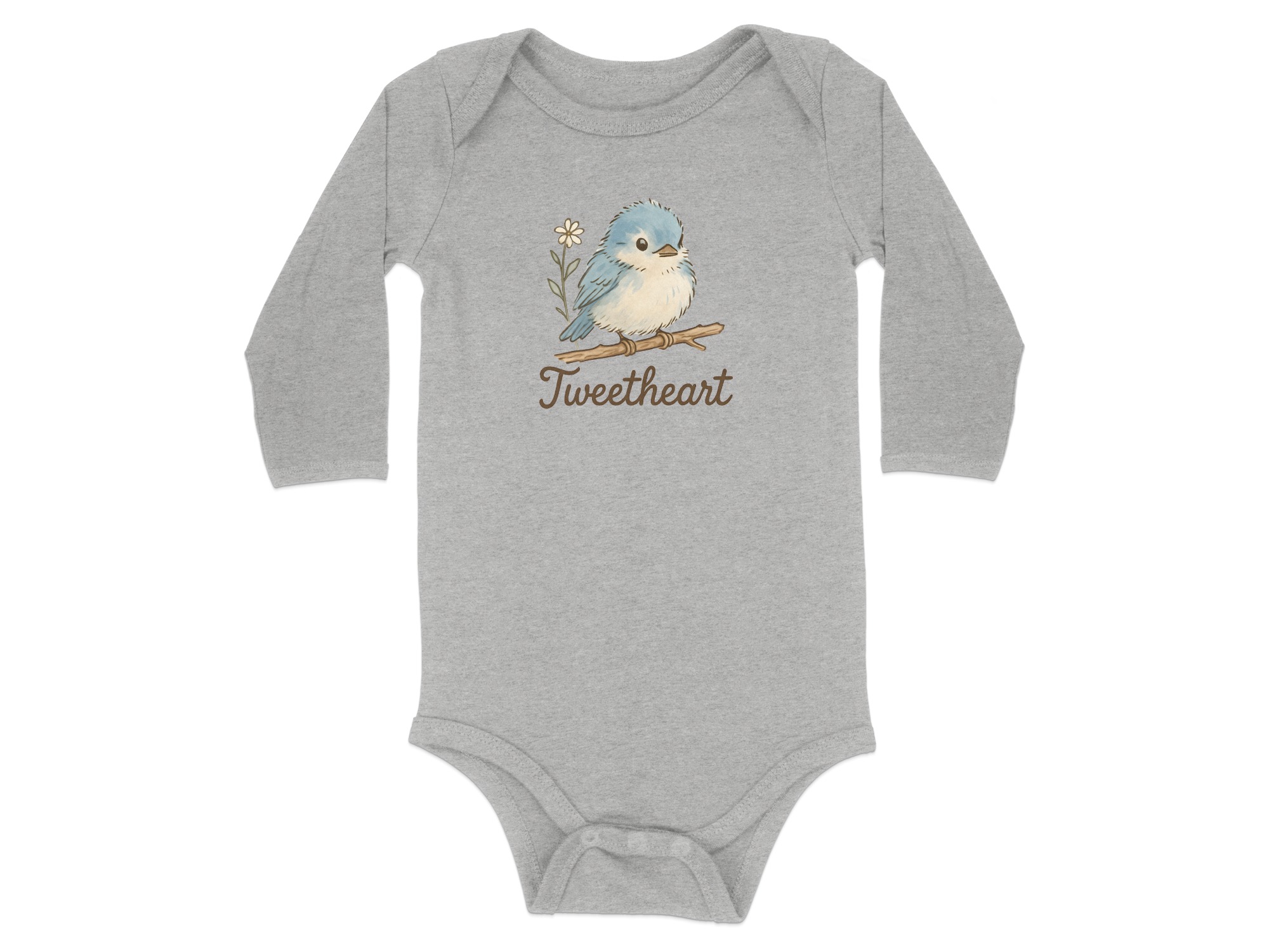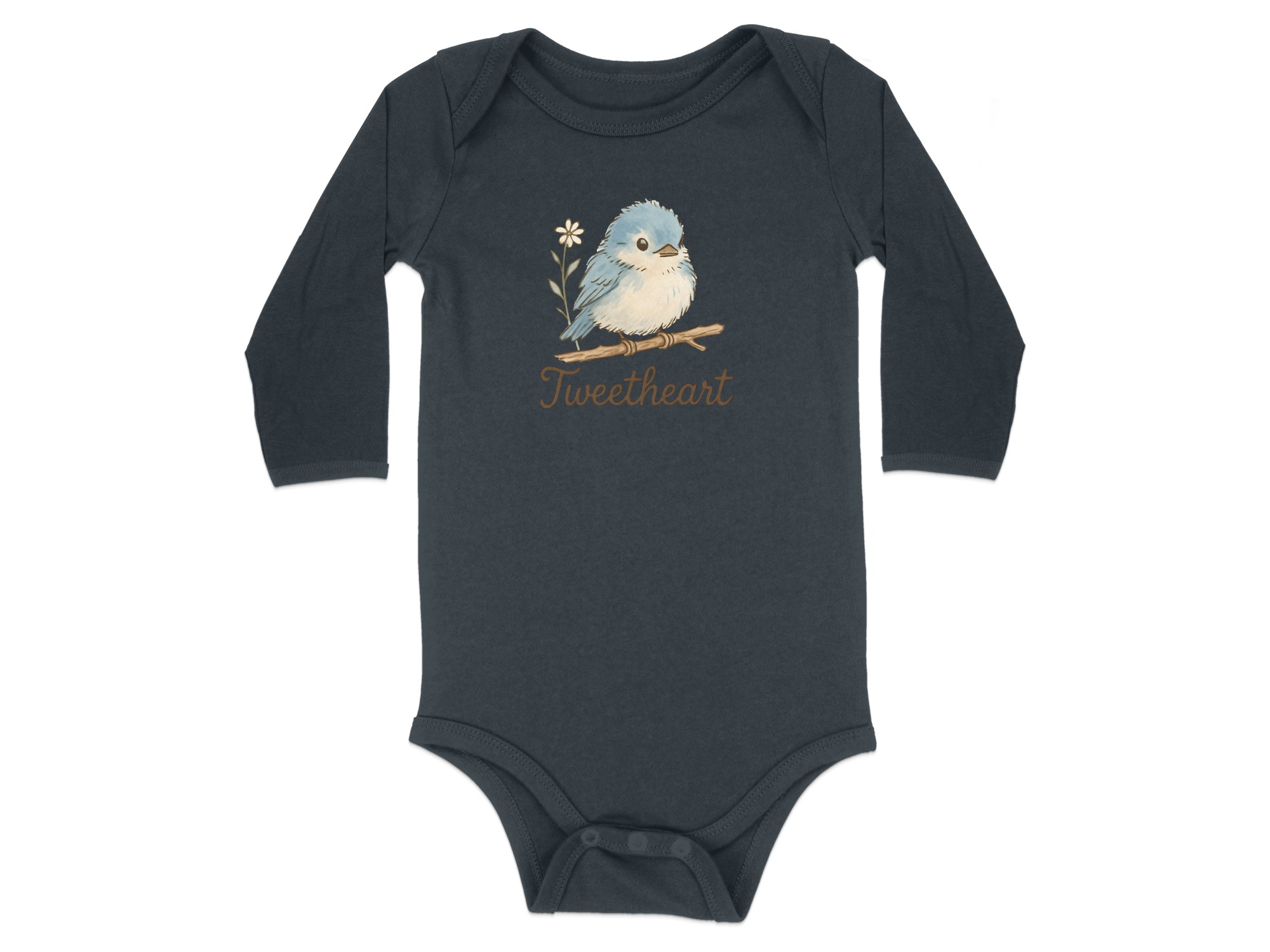 Adorable “Tweetheart” bodysuit featuring a cute blue bird on a branch with a daisy. Perfect for your little one! Find unique baby clothing here.