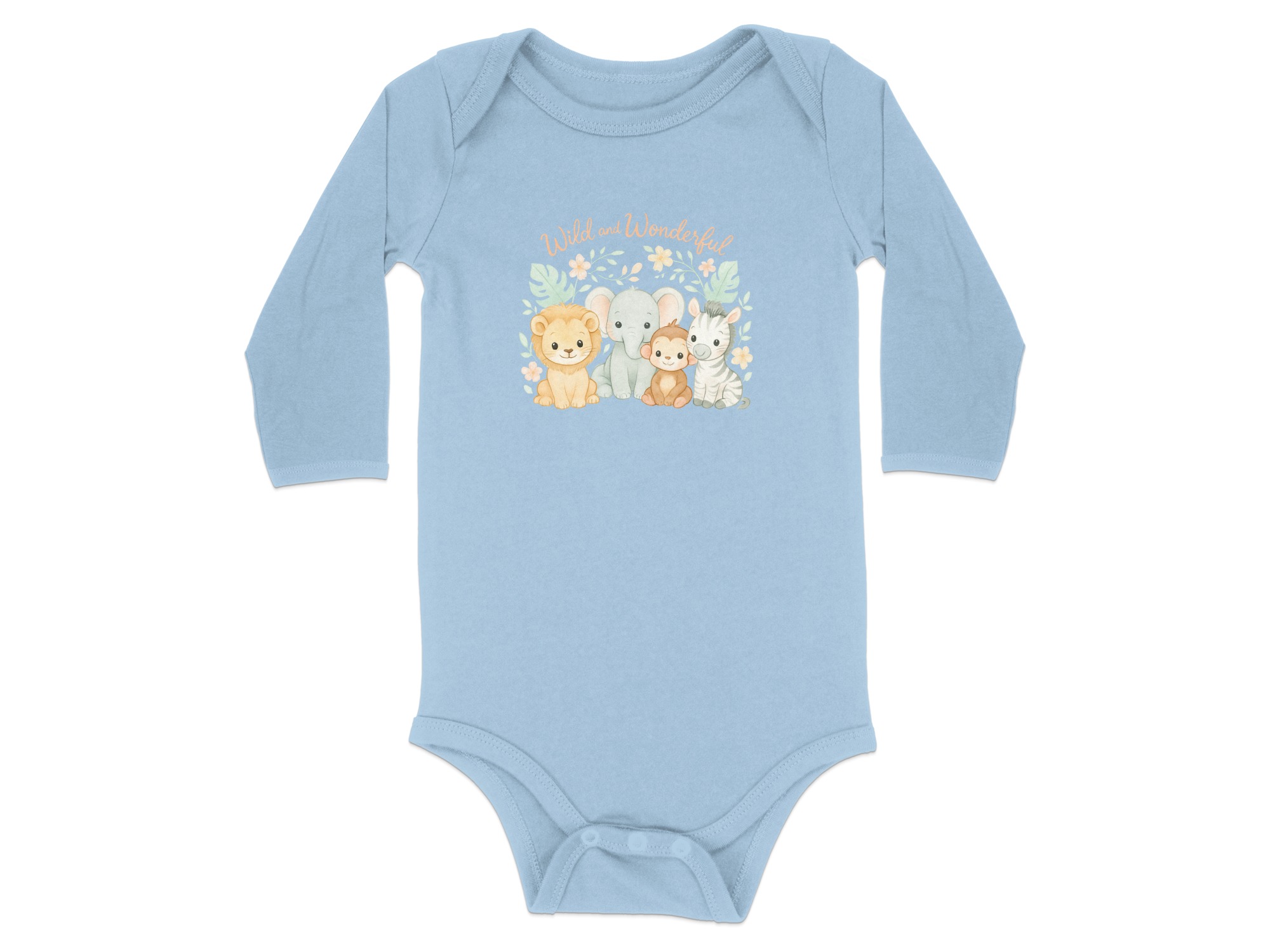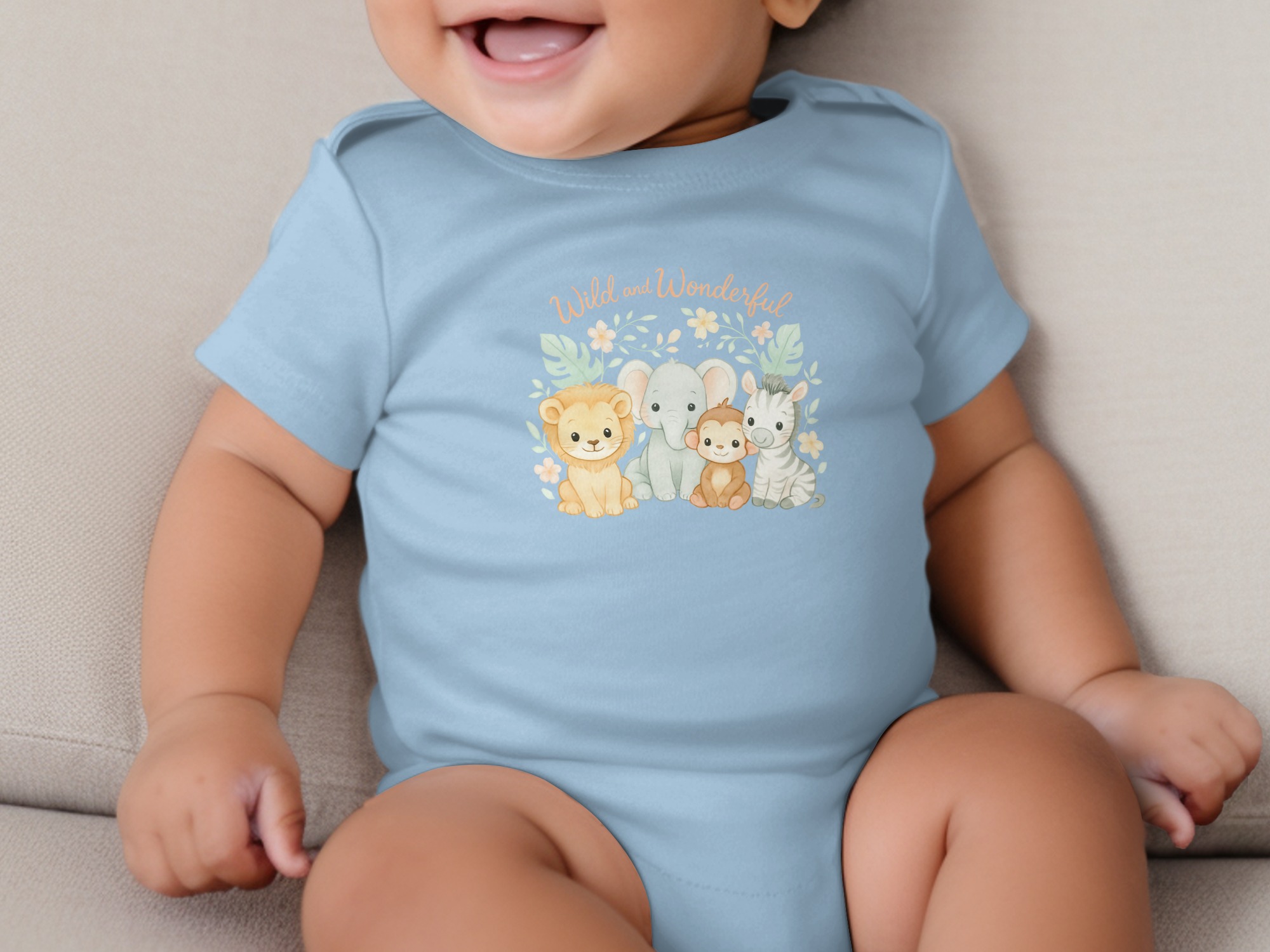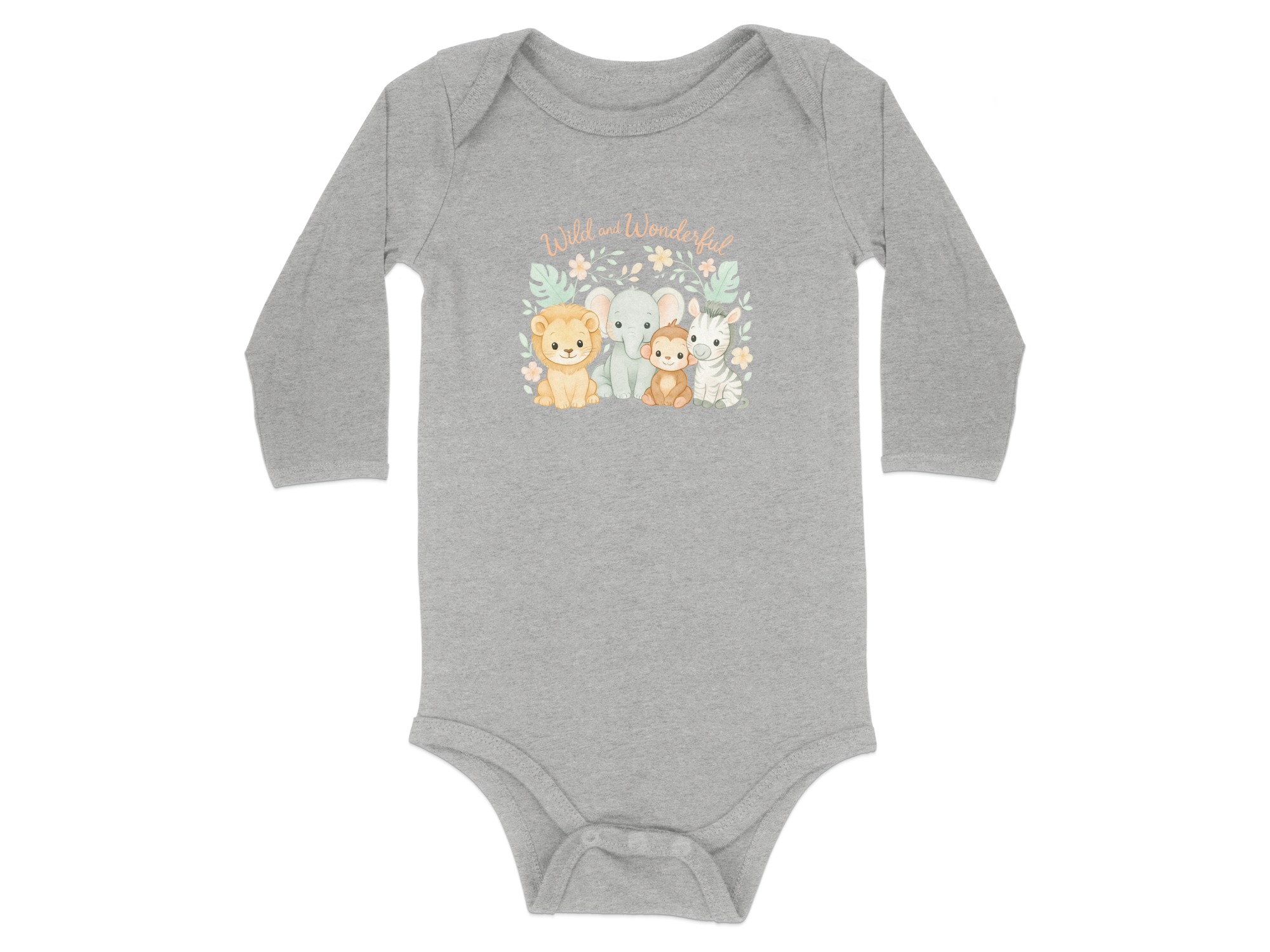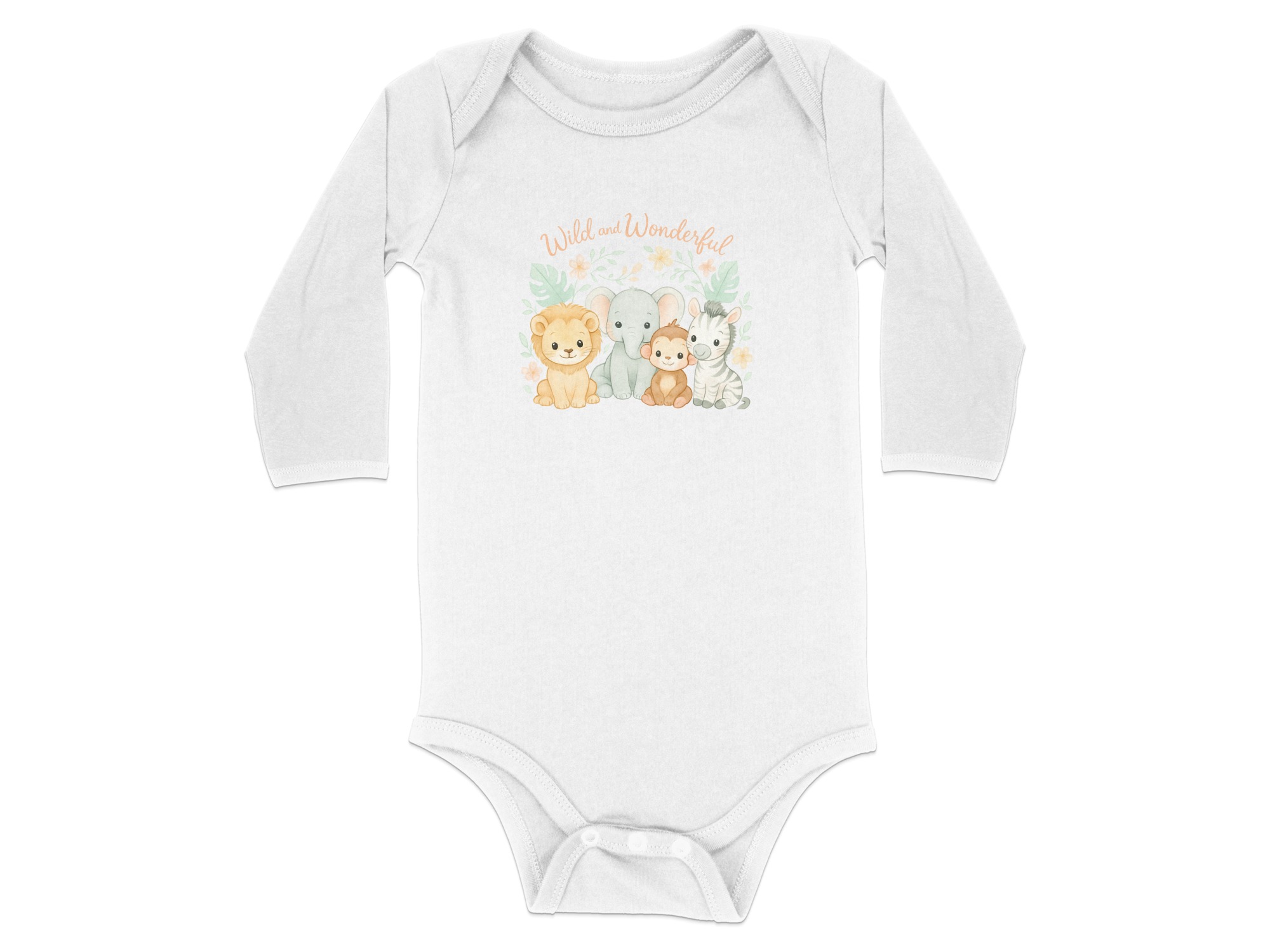 Dress your little one in this adorable “Wild and Wonderful” bodysuit featuring a cute watercolor safari animal design. This design includes a lion, elephant, monkey, and zebra, surrounded by delicate flowers and lush tropical leaves. Perfect for a baby shower gift, a newborn’s first outfit, or everyday wear. Available in both long and short sleeves, and in sizes newborn to 24 months.