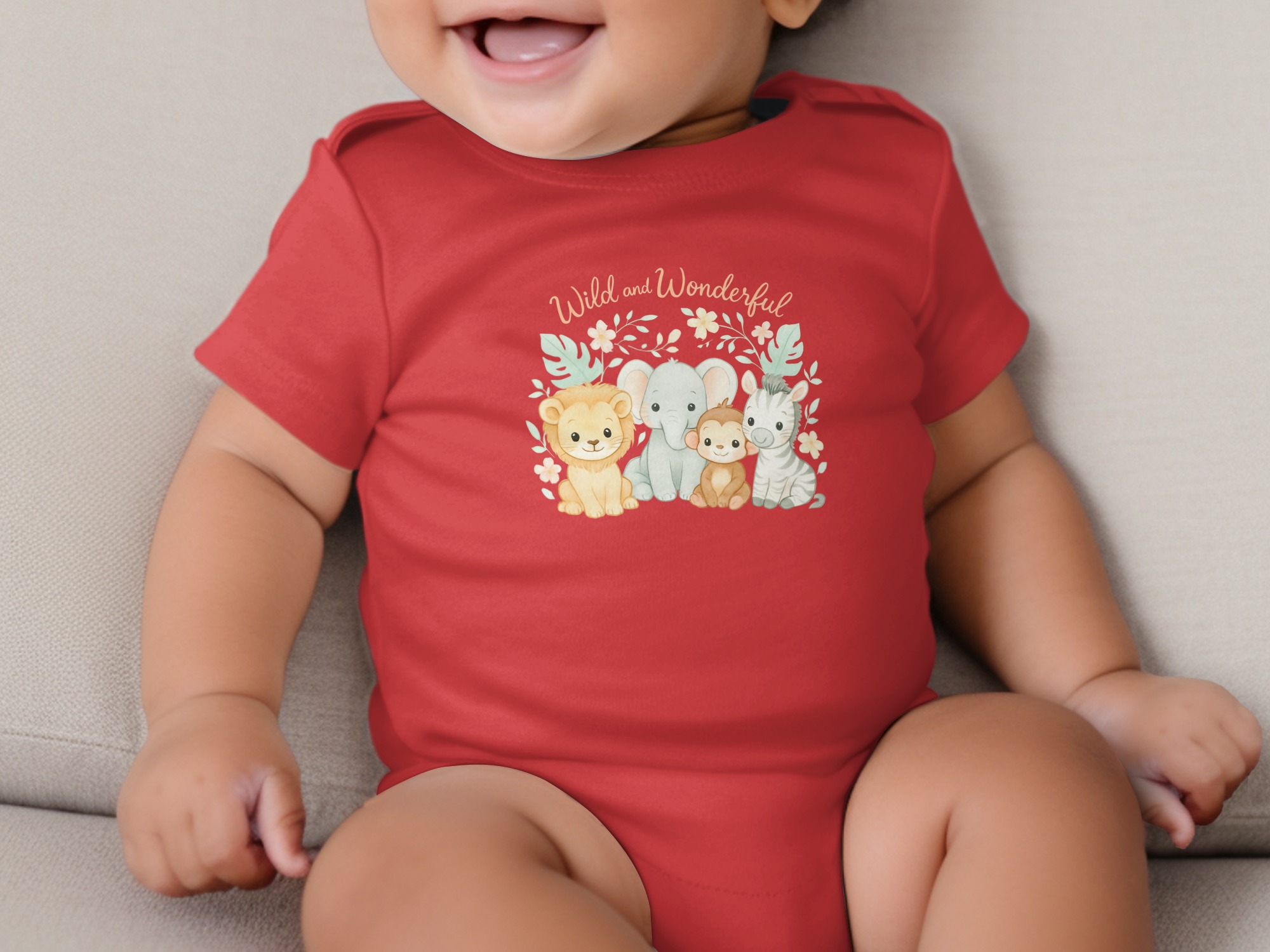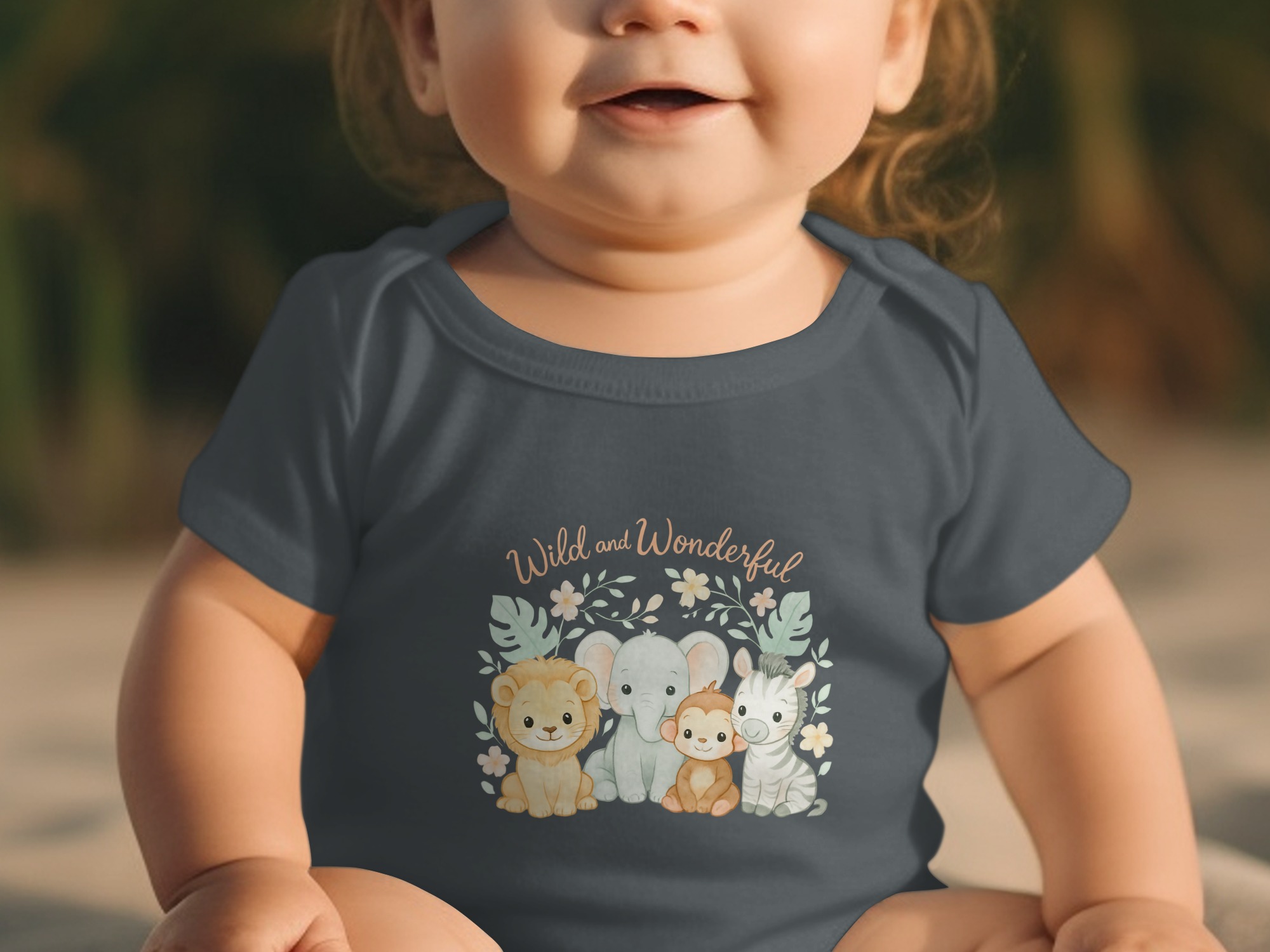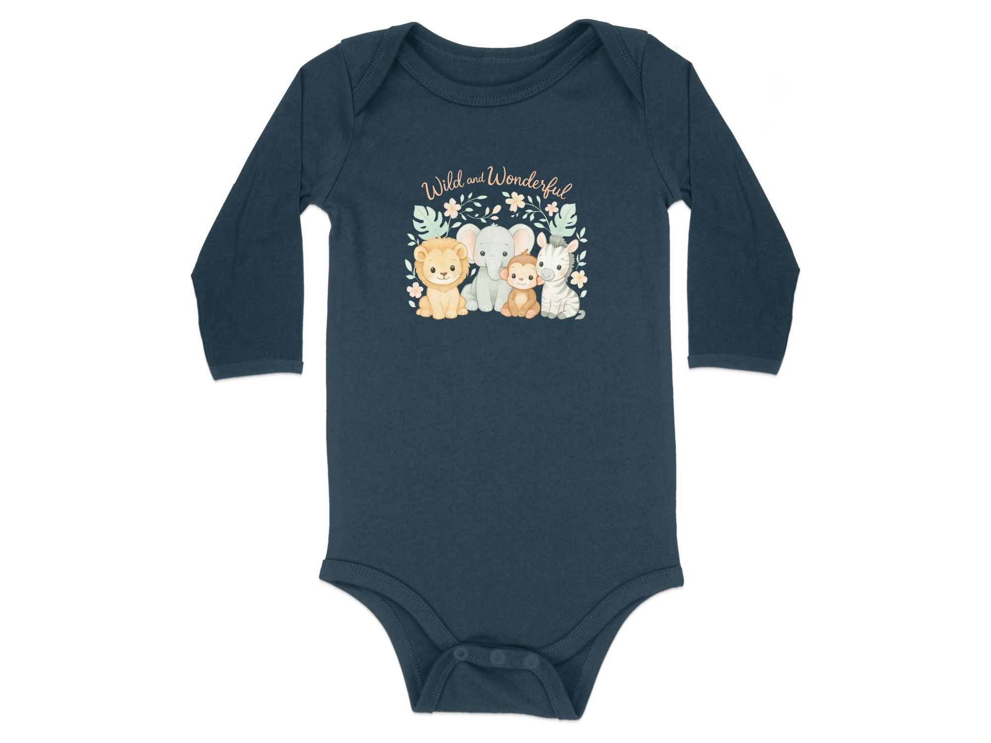 Dress your little one in this adorable “Wild and Wonderful” bodysuit featuring a cute watercolor safari animal design. This design includes a lion, elephant, monkey, and zebra, surrounded by delicate flowers and lush tropical leaves. Perfect for a baby shower gift, a newborn’s first outfit, or everyday wear. Available in both long and short sleeves, and in sizes newborn to 24 months.