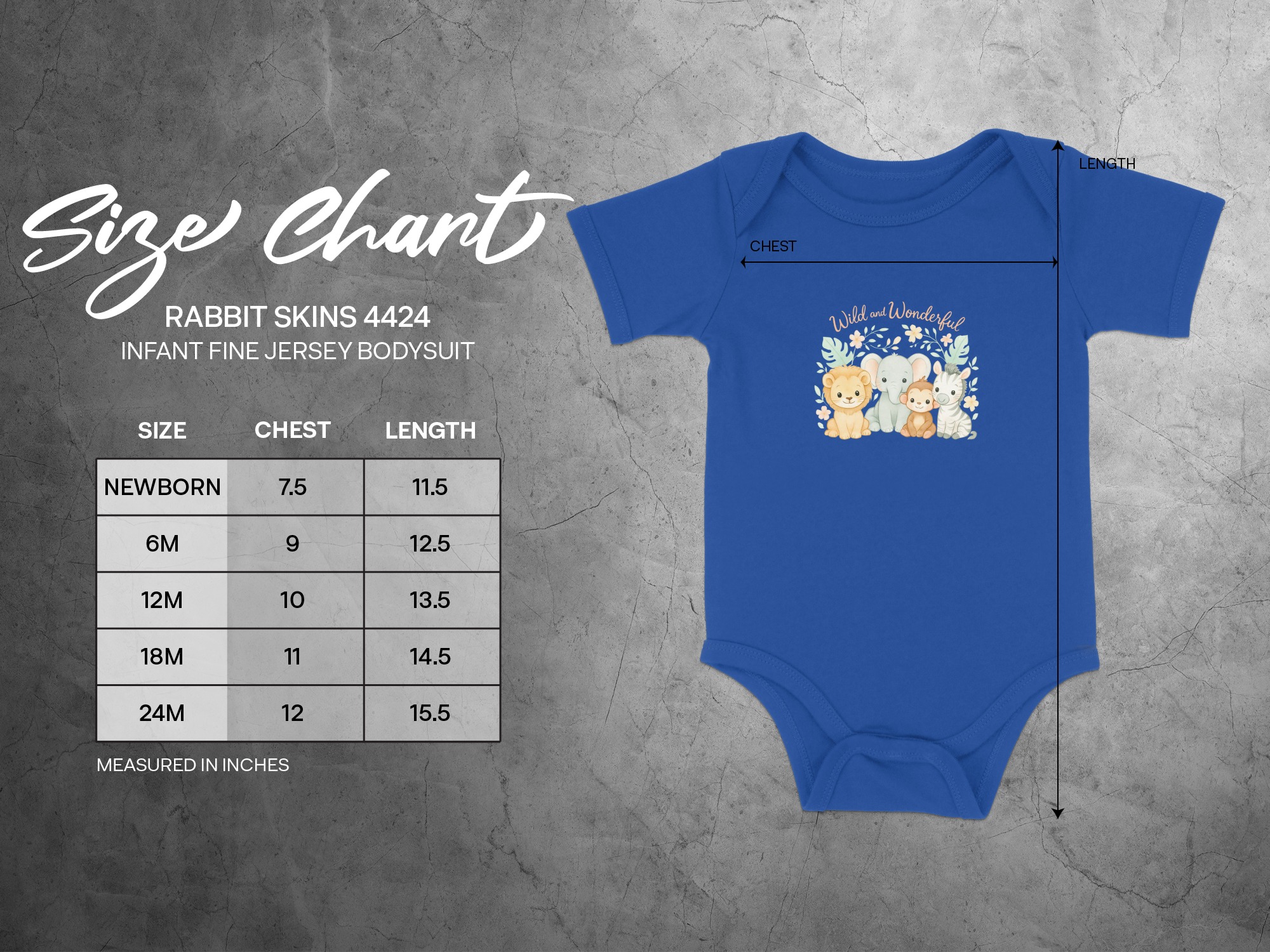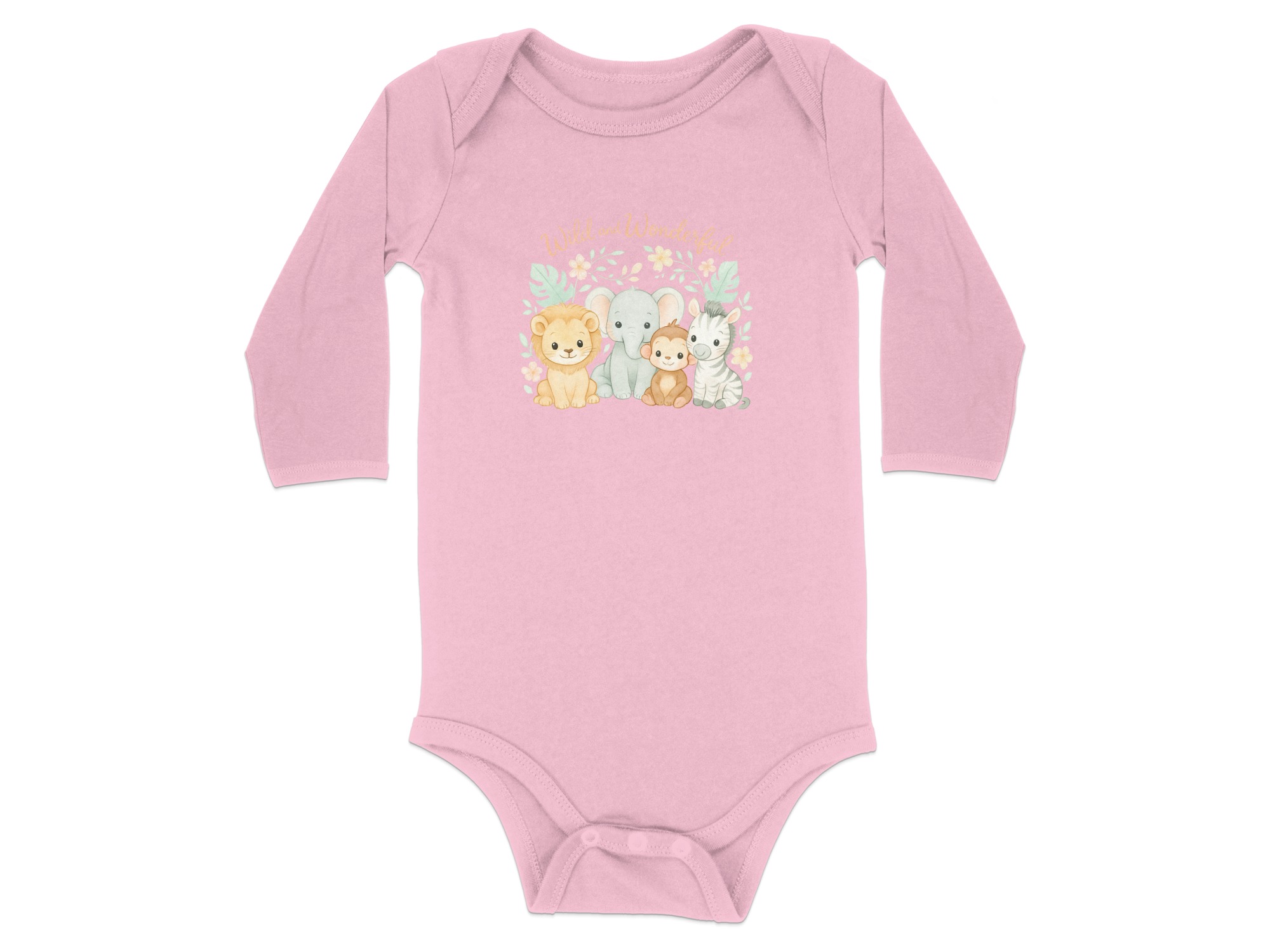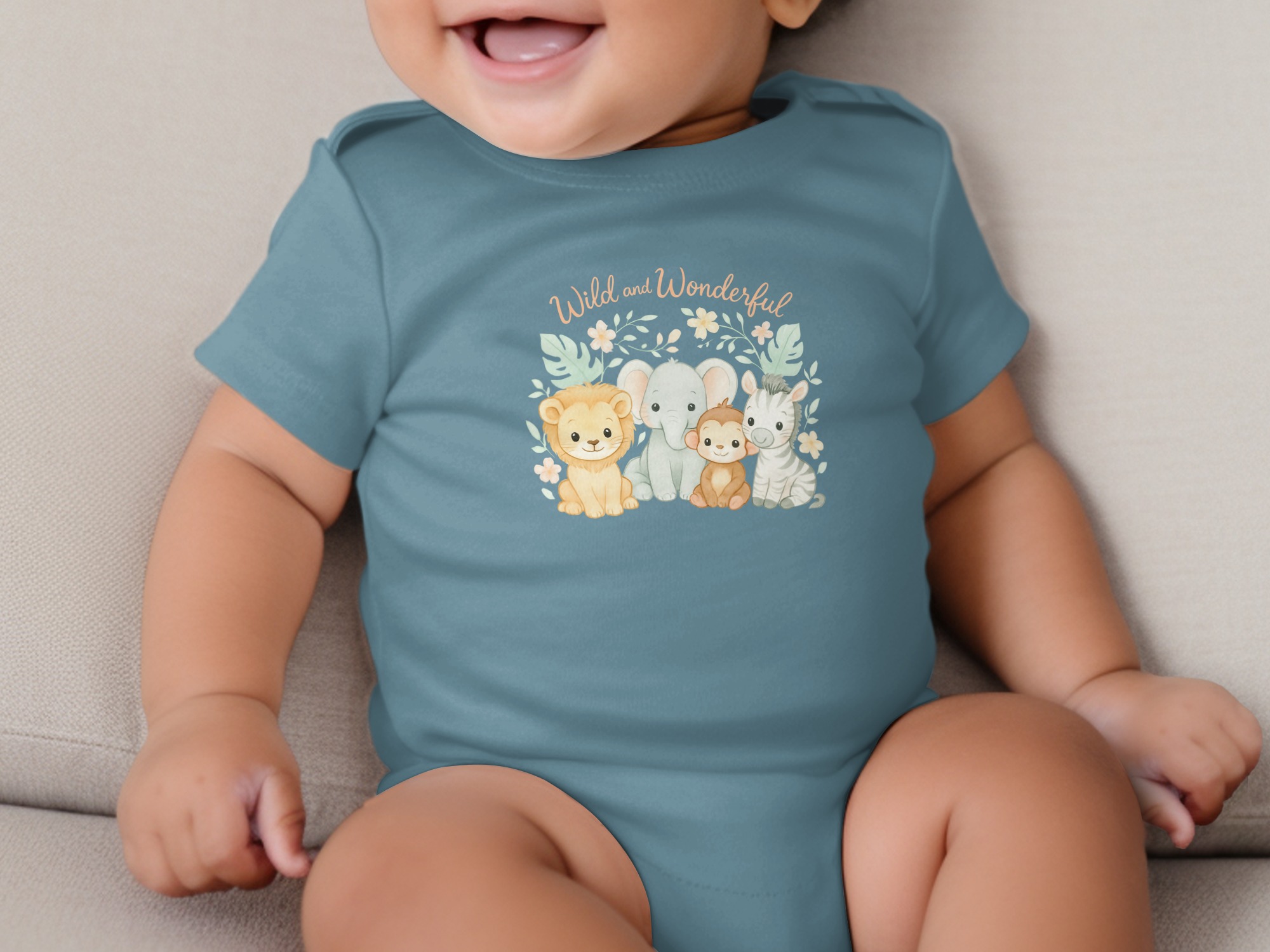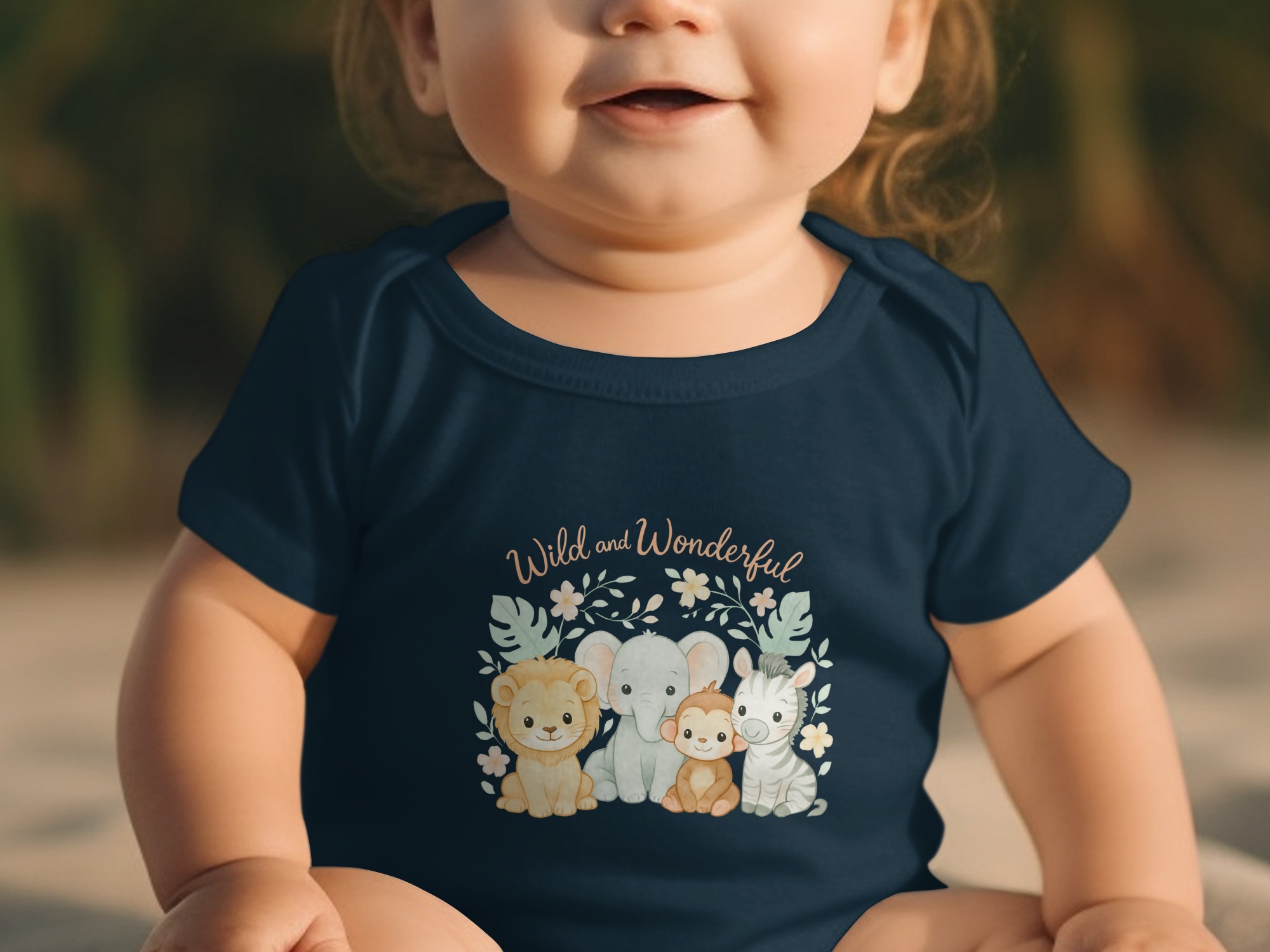 Dress your little one in this adorable “Wild and Wonderful” bodysuit featuring a cute watercolor safari animal design. This design includes a lion, elephant, monkey, and zebra, surrounded by delicate flowers and lush tropical leaves. Perfect for a baby shower gift, a newborn’s first outfit, or everyday wear. Available in both long and short sleeves, and in sizes newborn to 24 months.