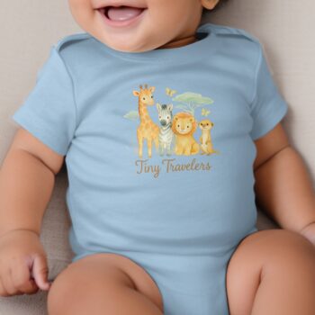 Tiny Travelers Bodysuit NB to 24M, Safari Animals Giraffe Zebra Lion Meerkat, Long Sleeve Short Sleeve Bodysuit, Cute Baby Gift Idea